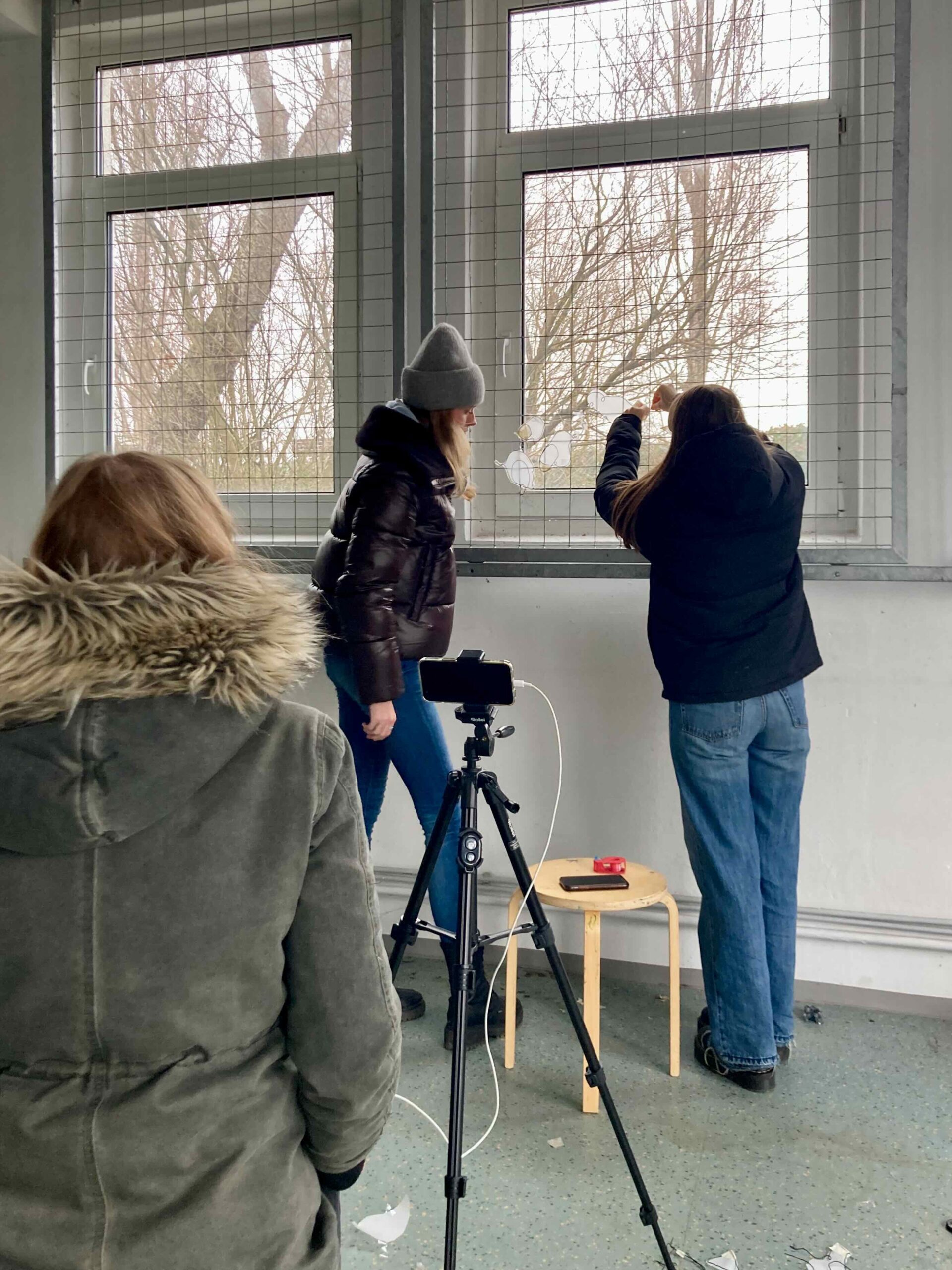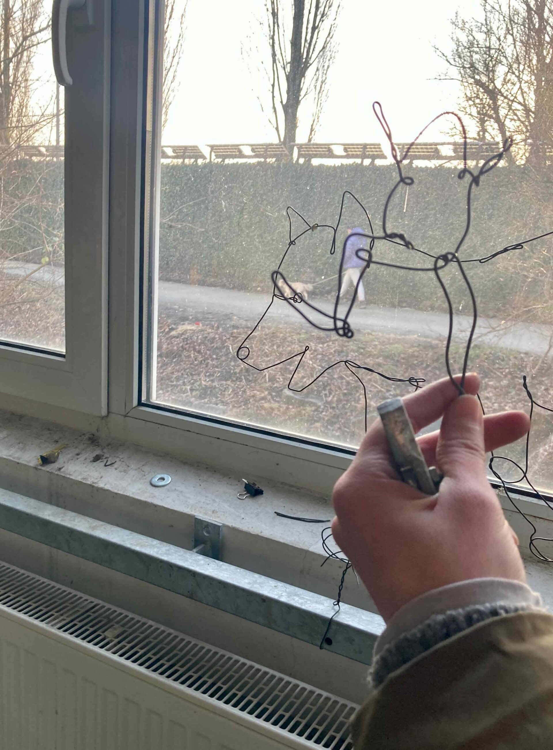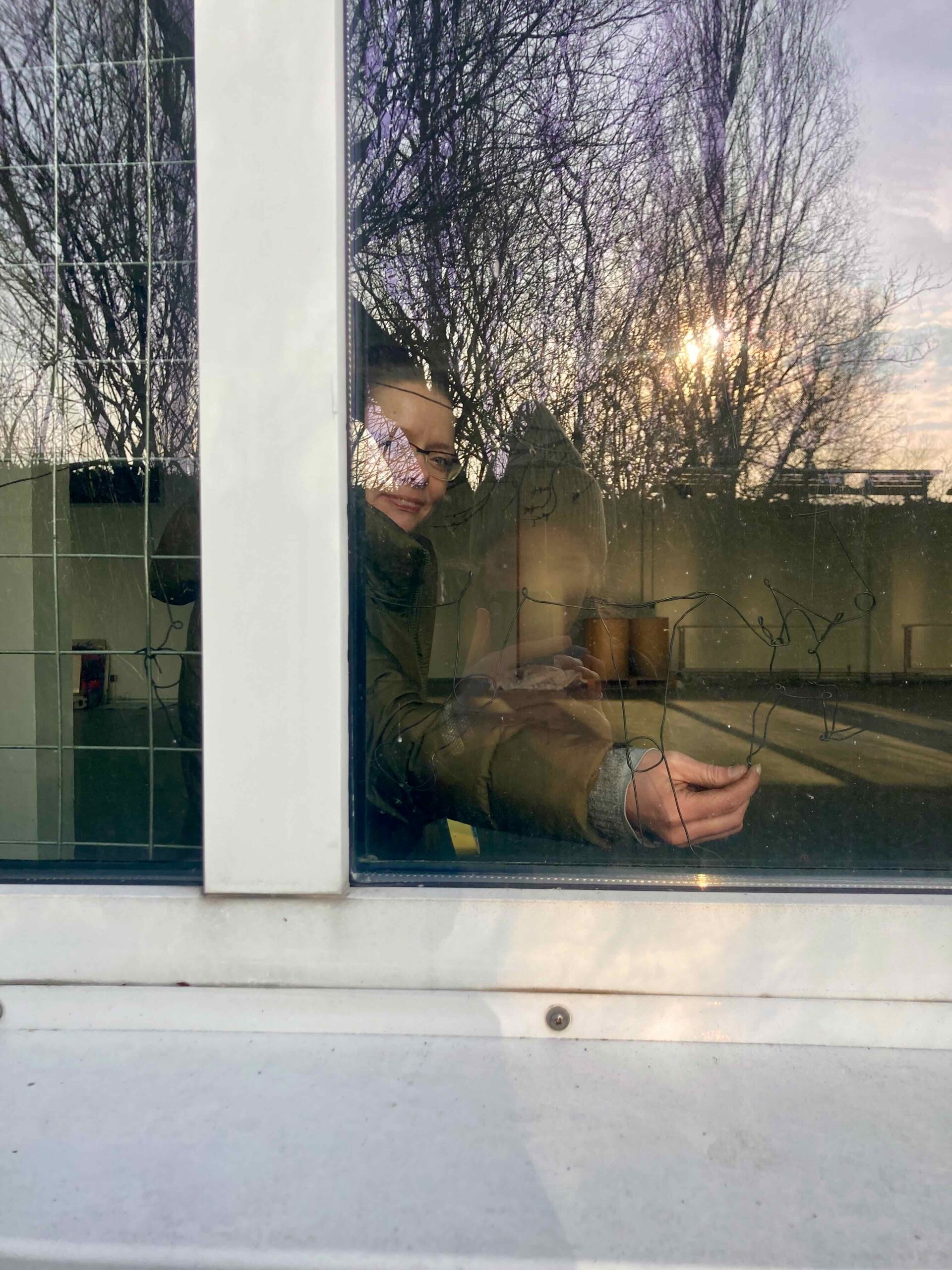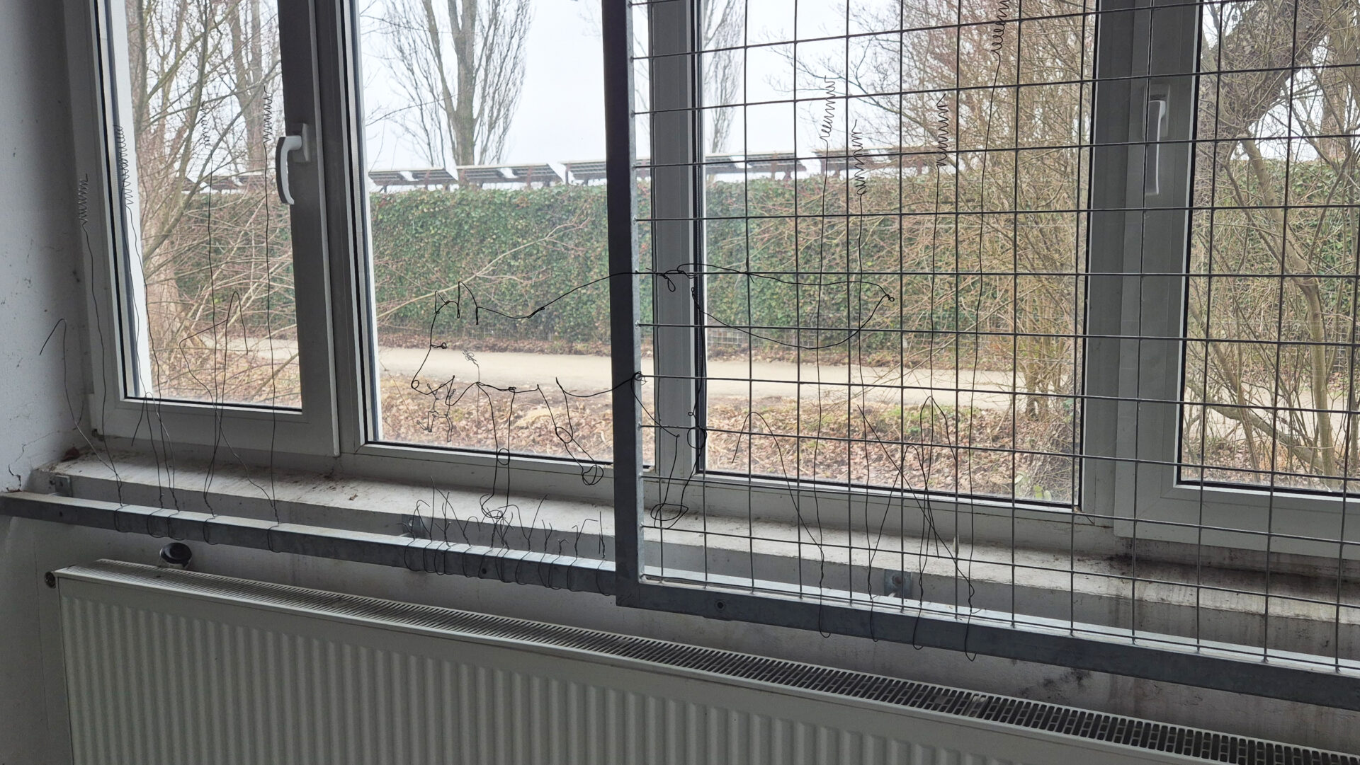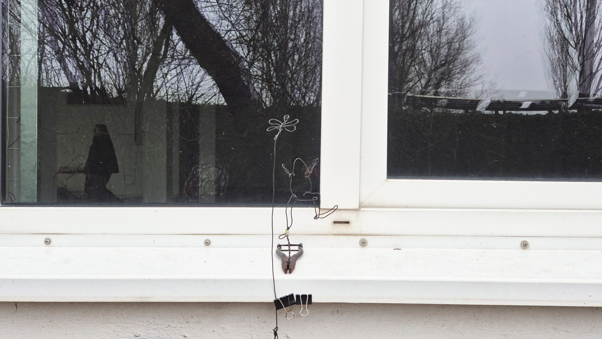 Schritt für Schritt werden die Stahlformen am Metallgitter des Fensters befestigt. Das Raster, ursprünglich als Schutz und Abgrenzung gedacht, wird zur Projektionsfläche einer Geschichte. Die starre Ordnung des Gitters steht im Kontrast zu den fließenden Linien des Vogelflugs. Grenze wird nicht aufgehoben, sondern neu gelesen.