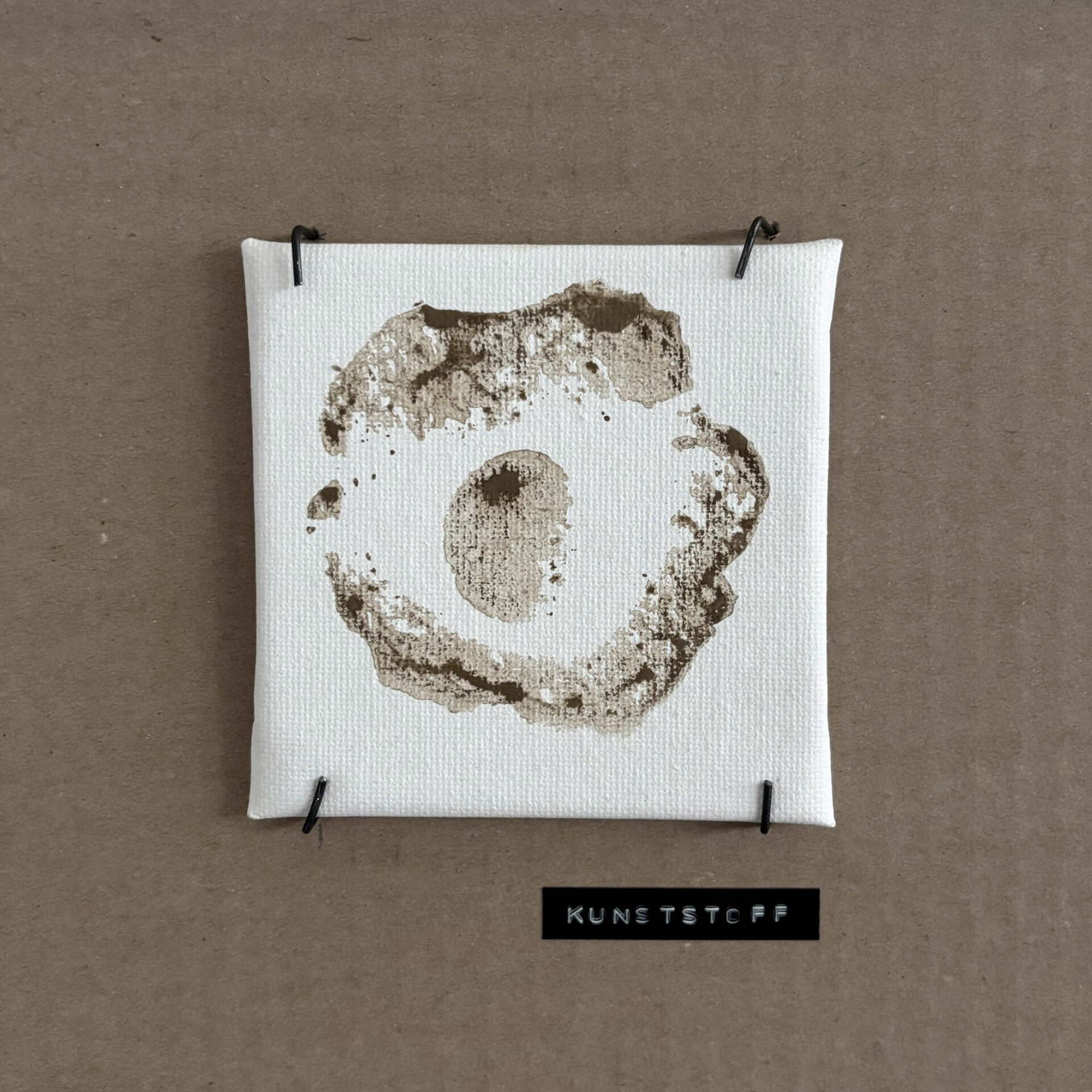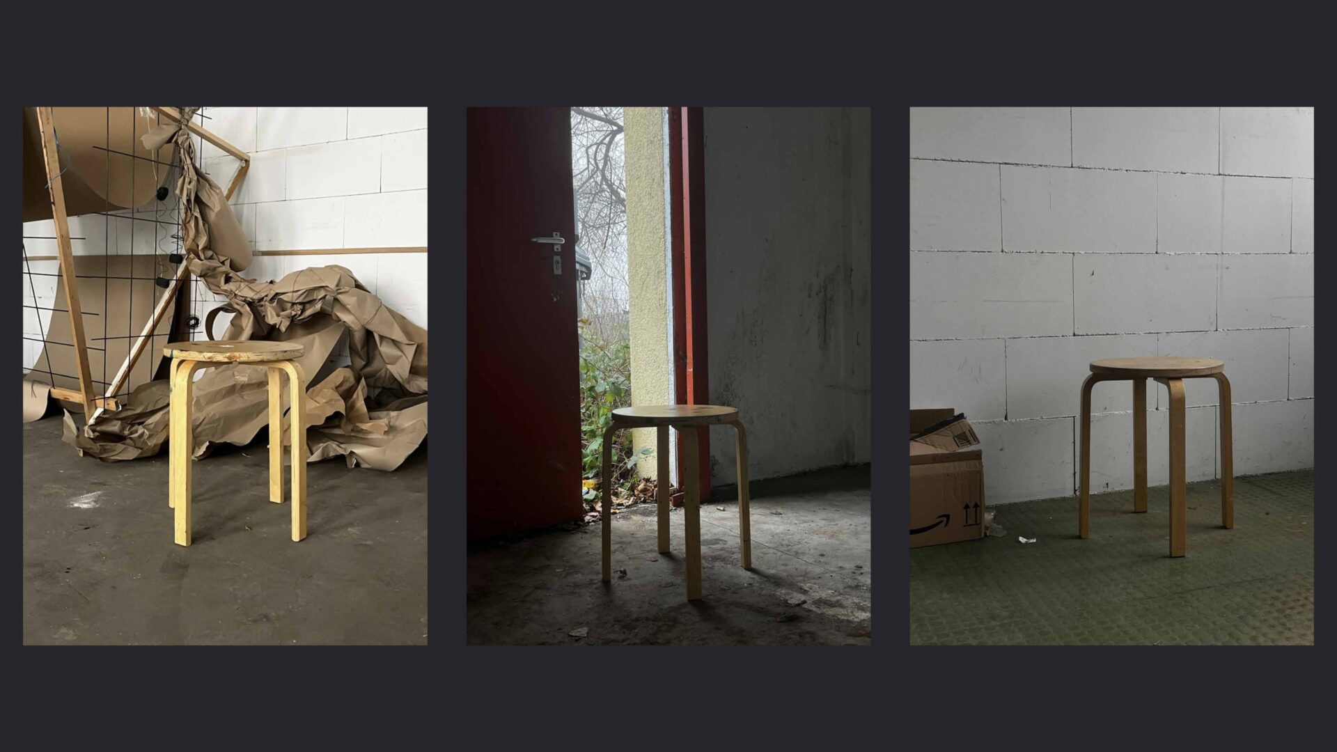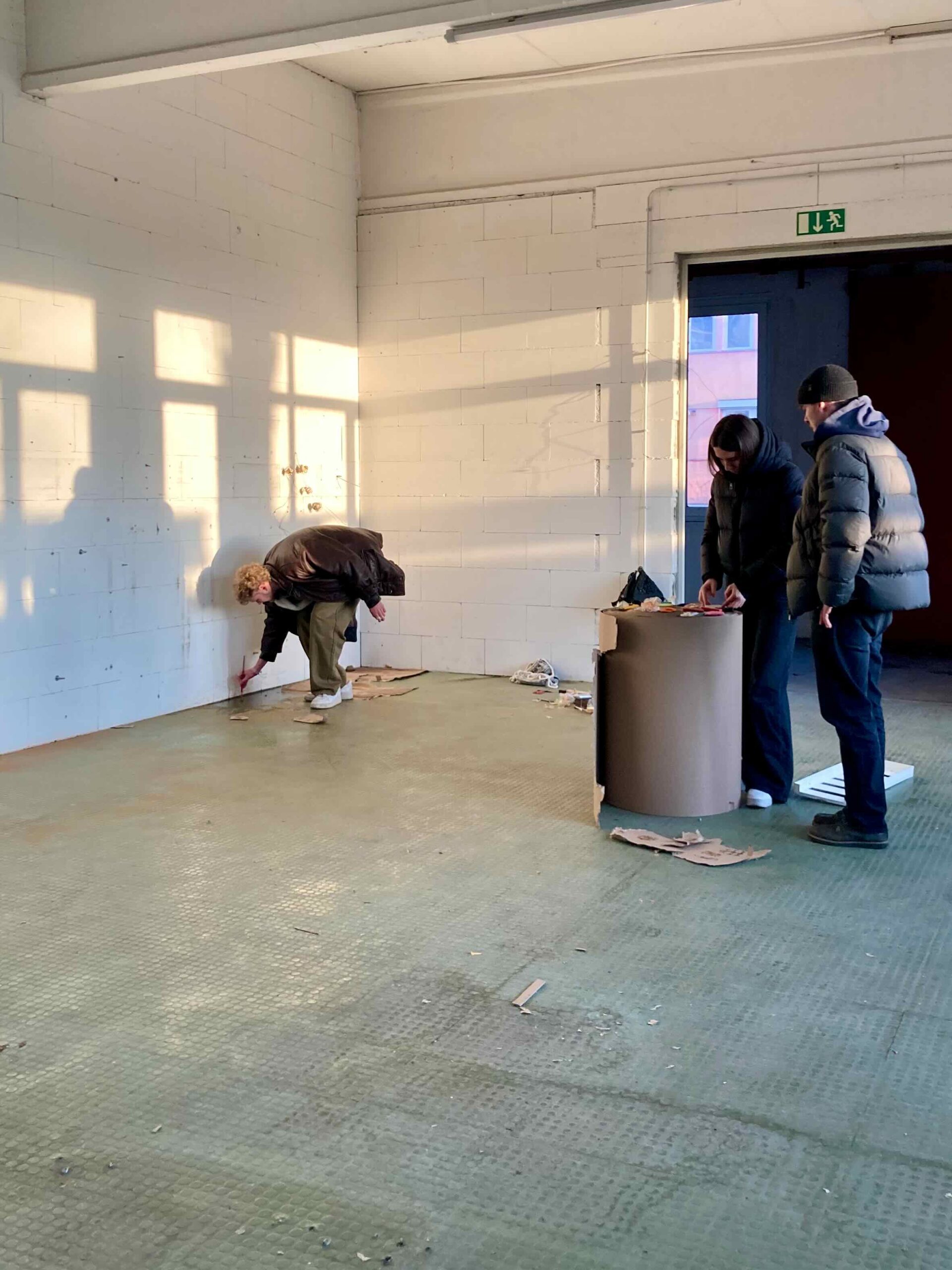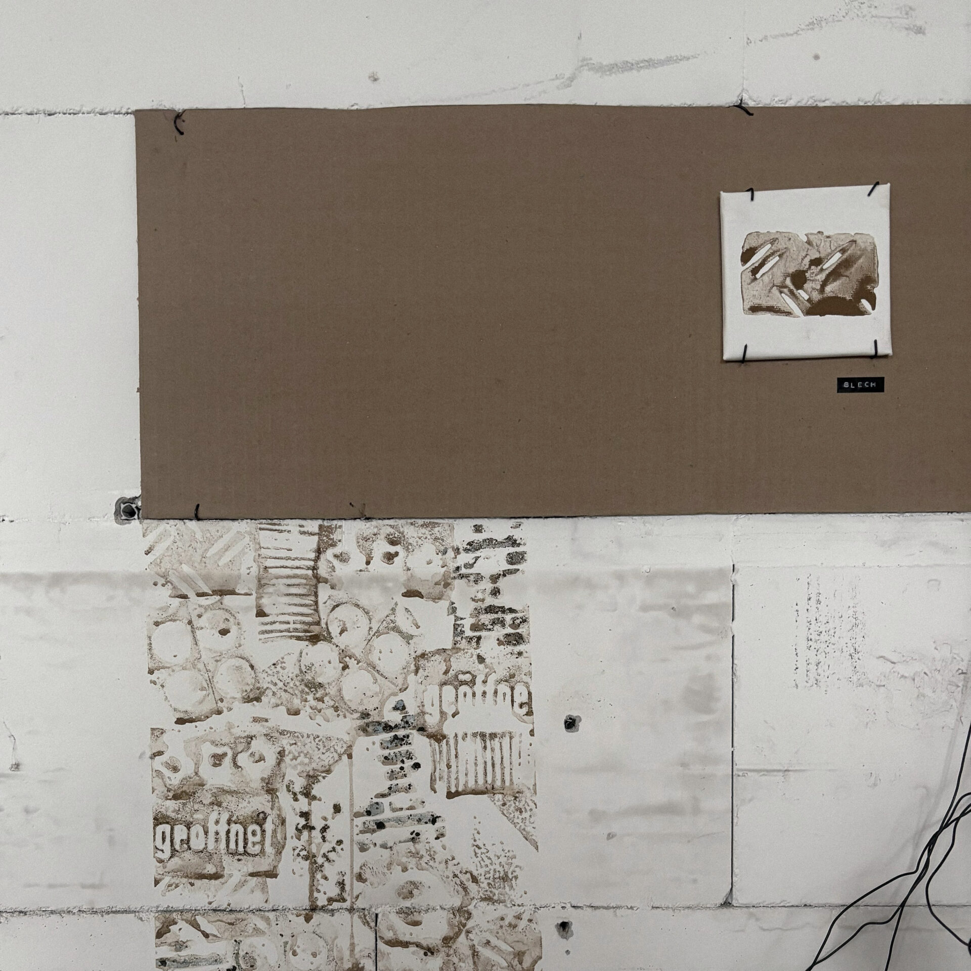 Ausgehend vom Boden wandert der Dreck an die Wand und formt dort eine Stempeltapete, die Strukturen des Gebäudes aufnimmt und weiterführt. Diese Bewegung verdichtet sich in einem horizontalen Streifen aus vor Ort gefundener Pappe, der als Präsentationsebene dient. Auf ihm werden die mit Dreck gestempelten Leinwände in einer bewusst musealen Ordnung gezeigt – im deutlichen Kontrast zur rohen, schmutzigen Umgebung.