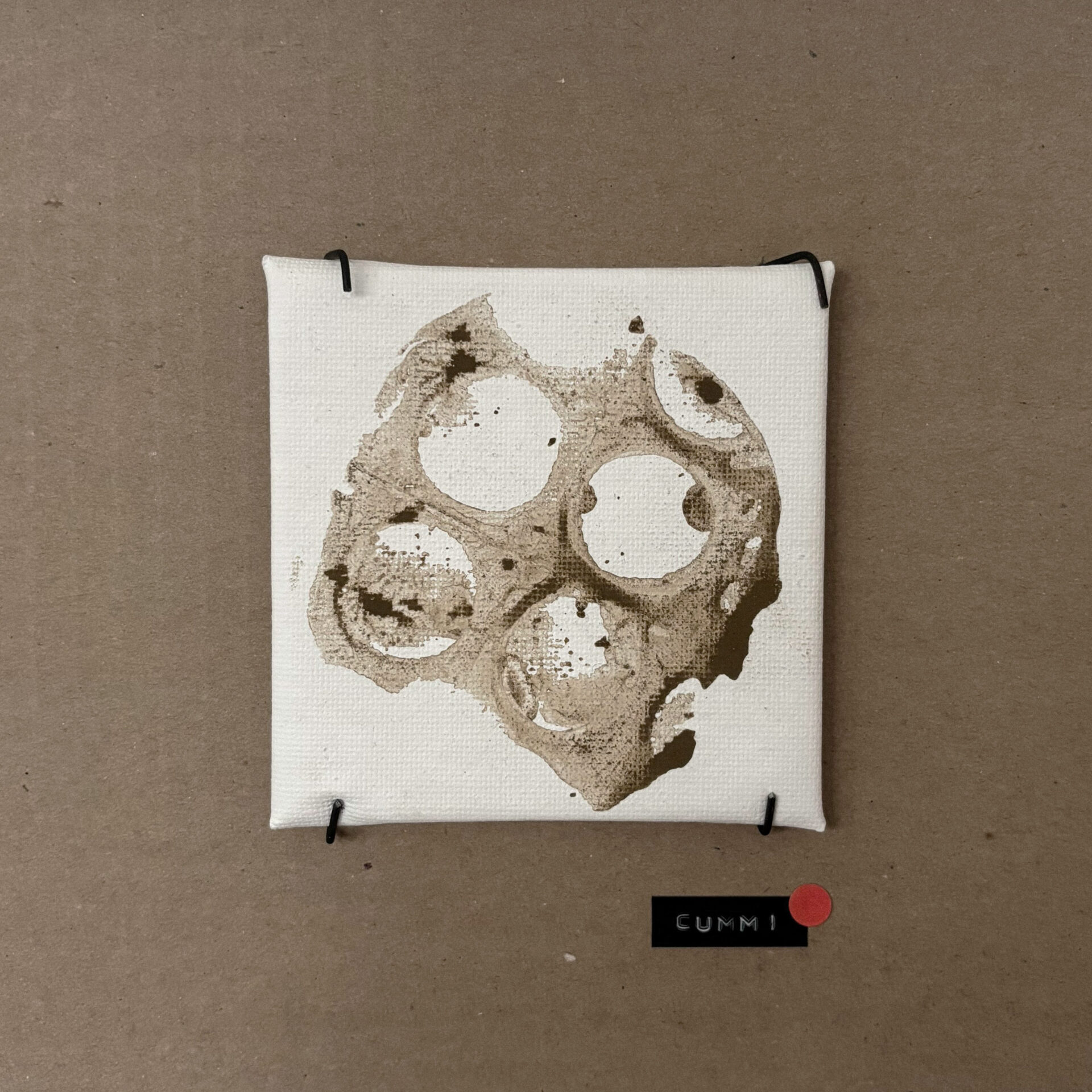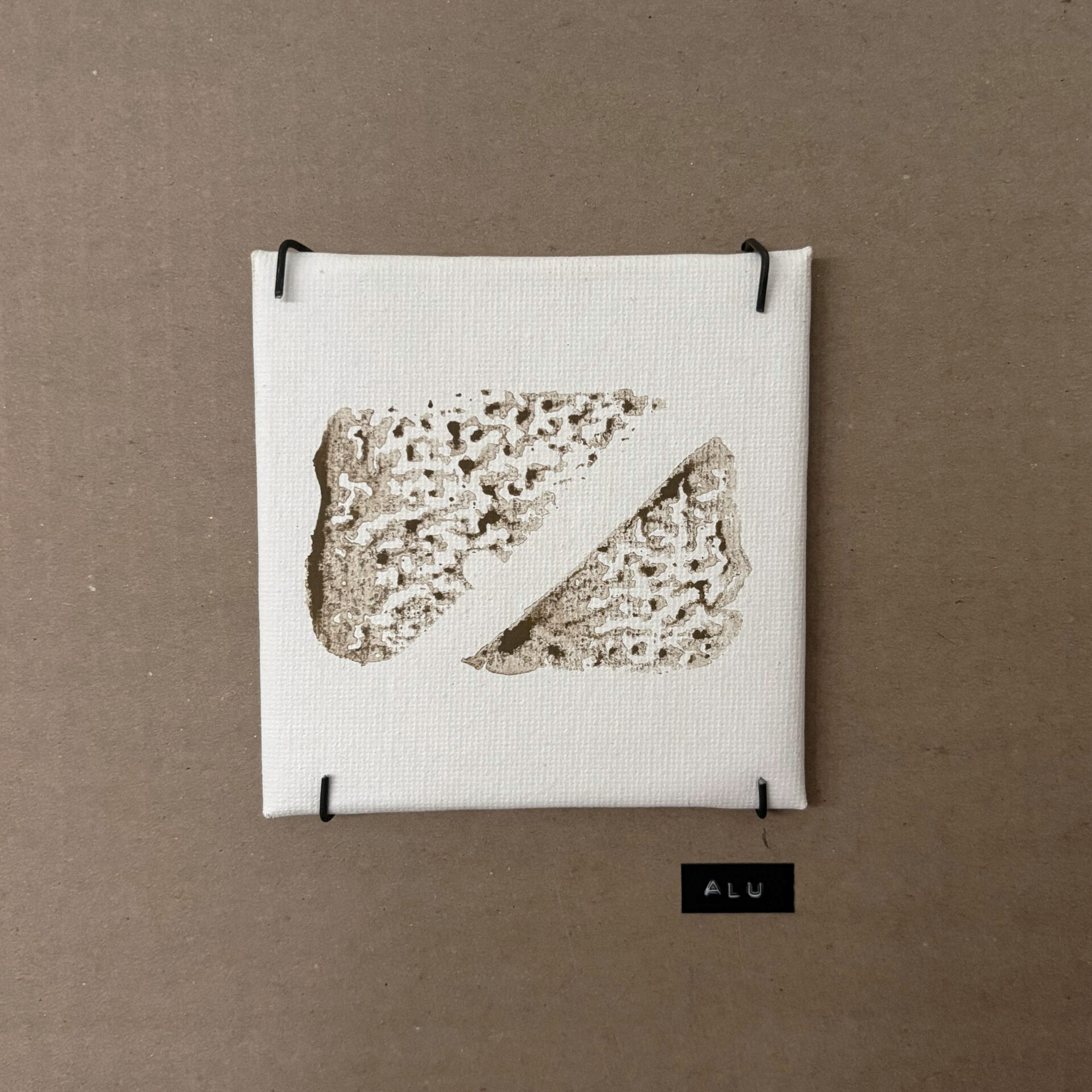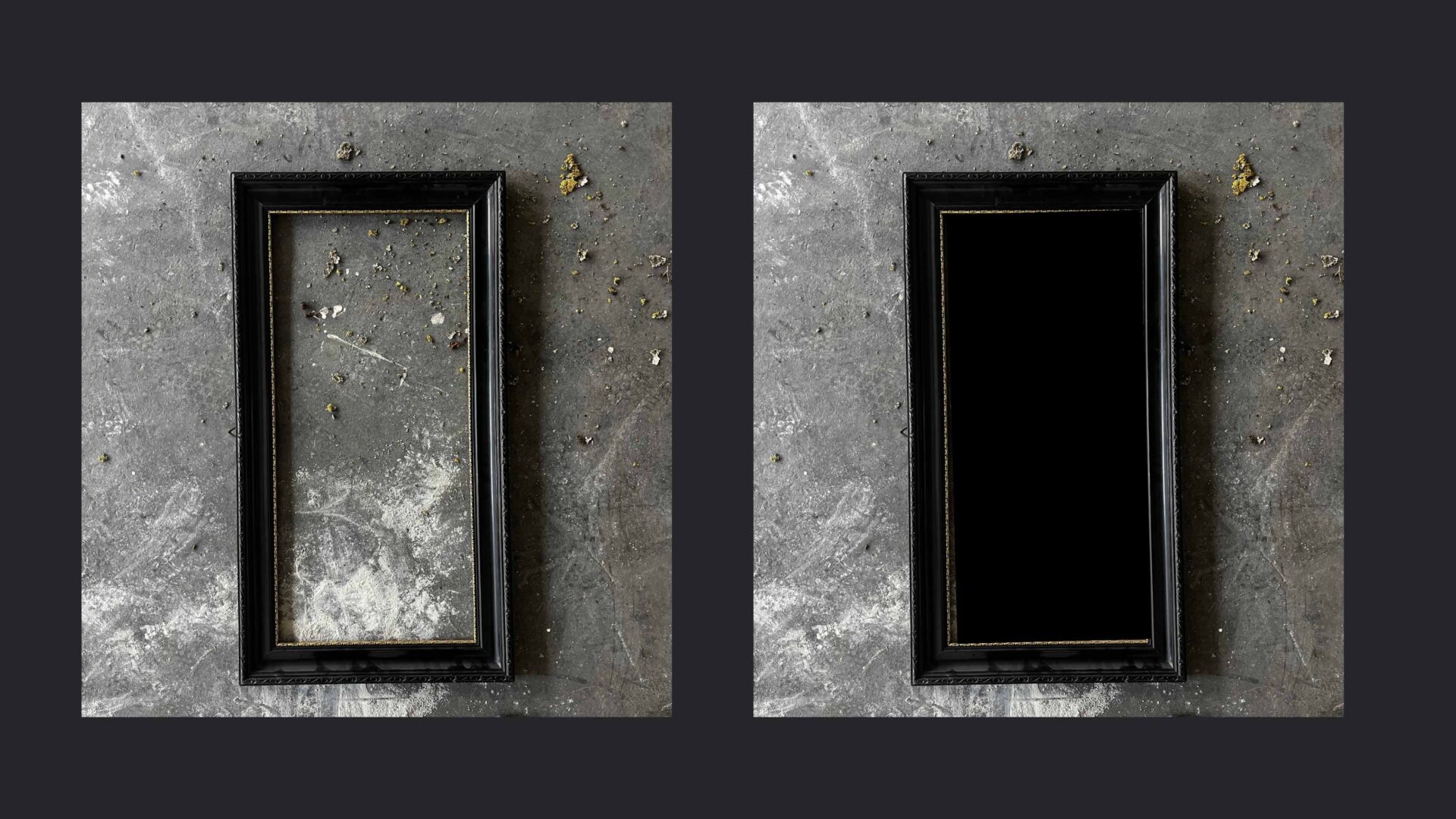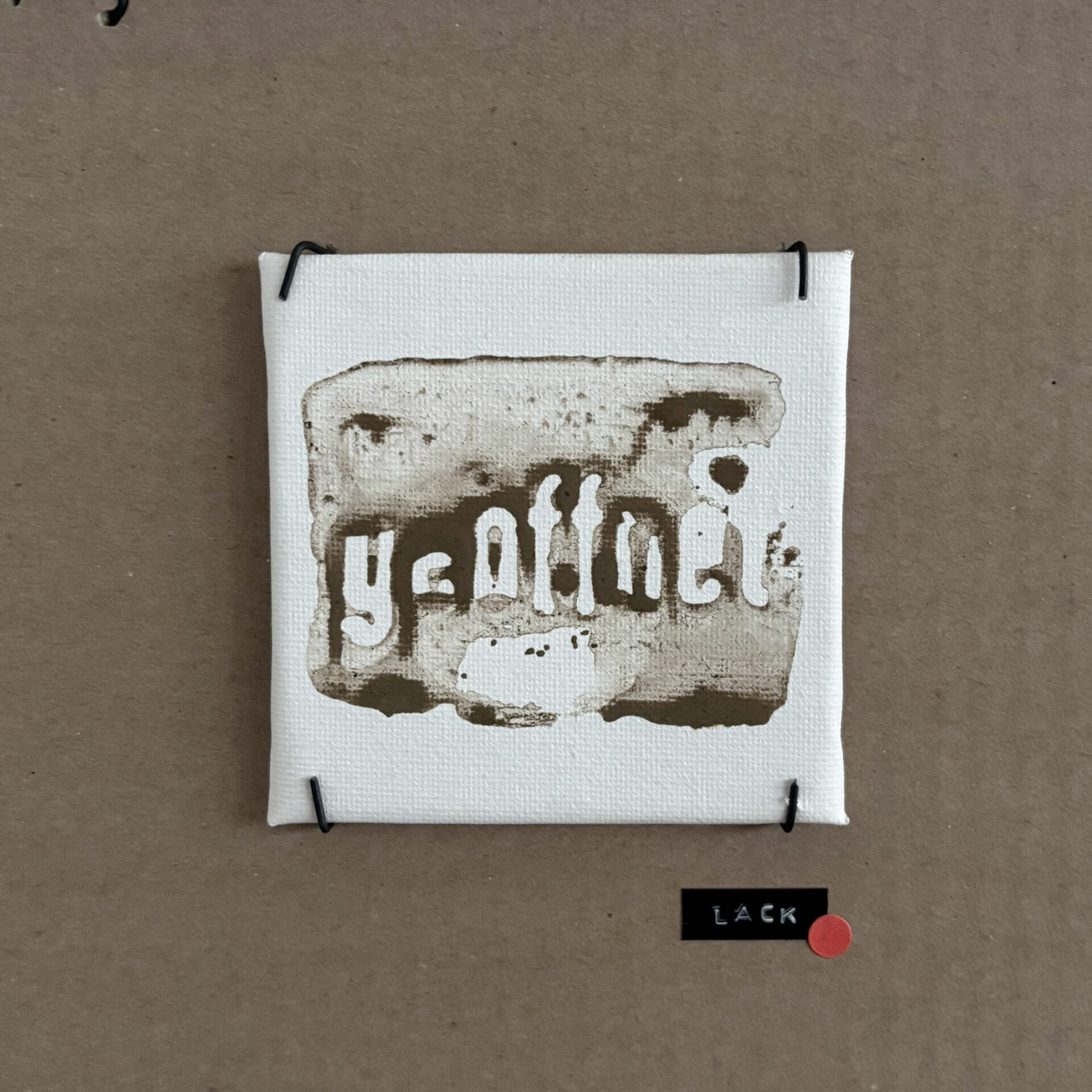 Ausgehend vom Boden wandert der Dreck an die Wand und formt dort eine Stempeltapete, die Strukturen des Gebäudes aufnimmt und weiterführt. Diese Bewegung verdichtet sich in einem horizontalen Streifen aus vor Ort gefundener Pappe, der als Präsentationsebene dient. Auf ihm werden die mit Dreck gestempelten Leinwände in einer bewusst musealen Ordnung gezeigt – im deutlichen Kontrast zur rohen, schmutzigen Umgebung.