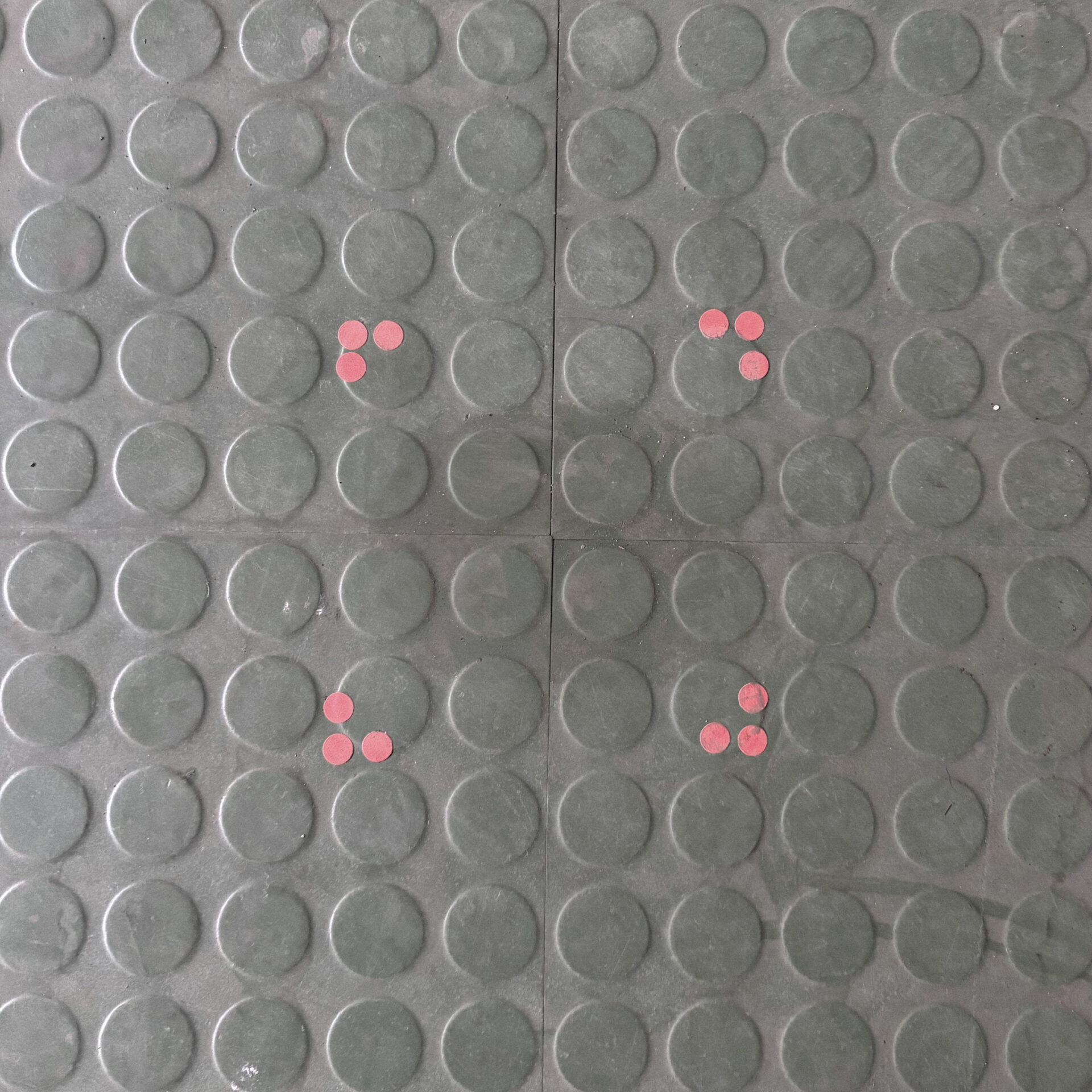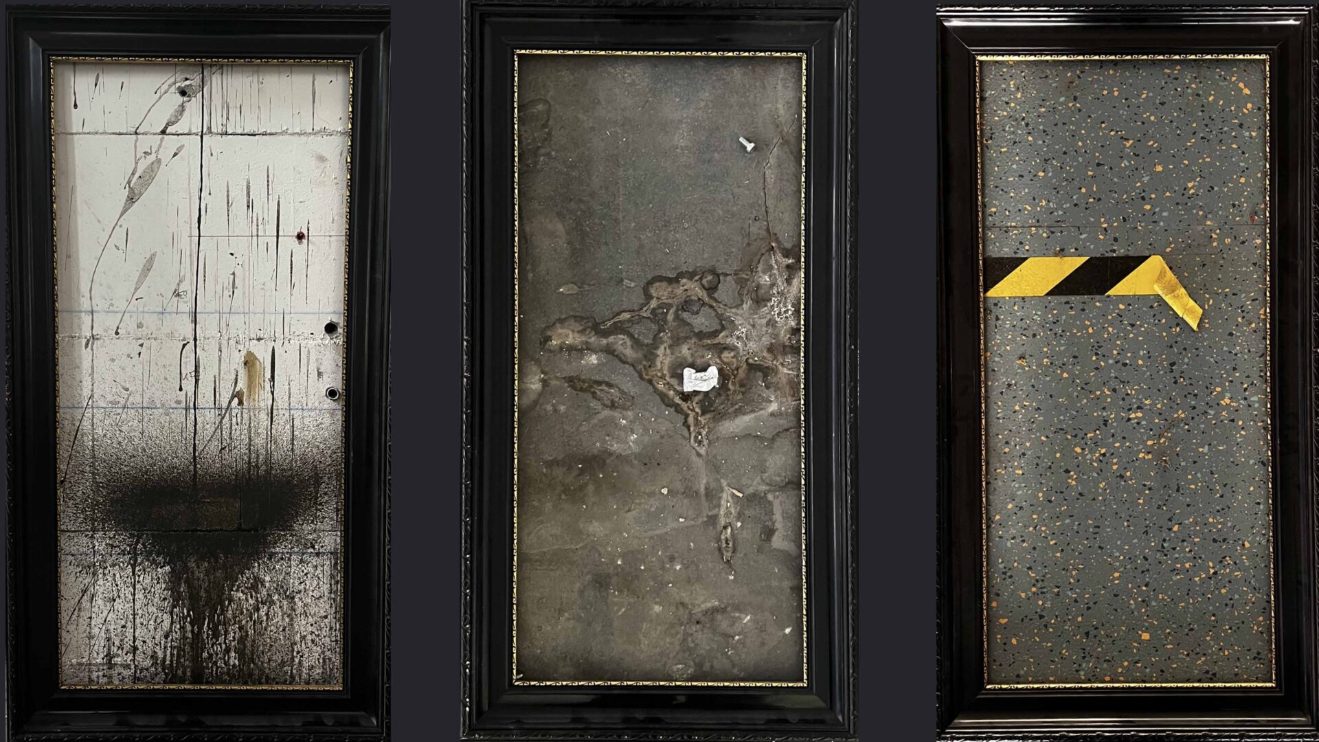 Die ursprünglichen Fundorte der verwendeten Gegenstände und Materialien sind im Raum durch rote Markierungen gekennzeichnet. Diese Verortung macht den Prozess nachvollziehbar und verbindet Werk, Raum und Herkunft unmittelbar miteinander. „Dreck“ versteht Verschmutzung nicht als Störung, sondern als Abdruck von Nutzung, Zeit und Bewegung.