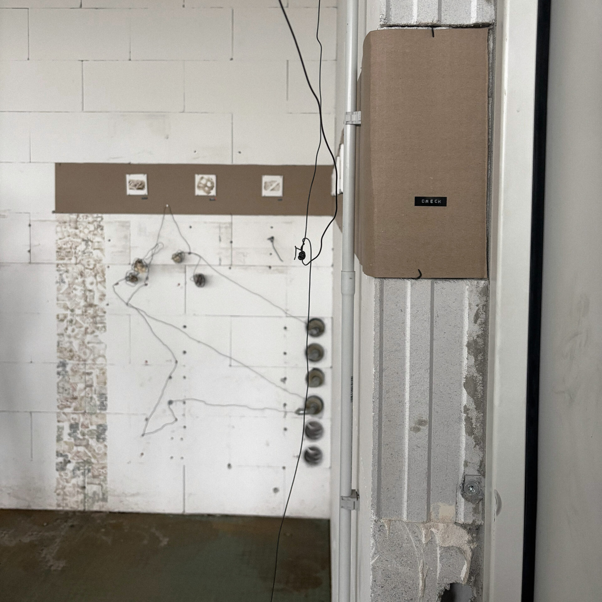 Verschiedene Oberflächen des Raumes werden in die Installation einbezogen: der Boden mit metallischem Schmutz und Wasser, die Wand mit den gestempelten Spuren, die Pappe, die um Ecken geführt wird und sich an bestehende Einbauten anschmiegt. Die Ausstellung entwickelt sich aus dem Ort heraus und bleibt materiell an ihn gebunden.