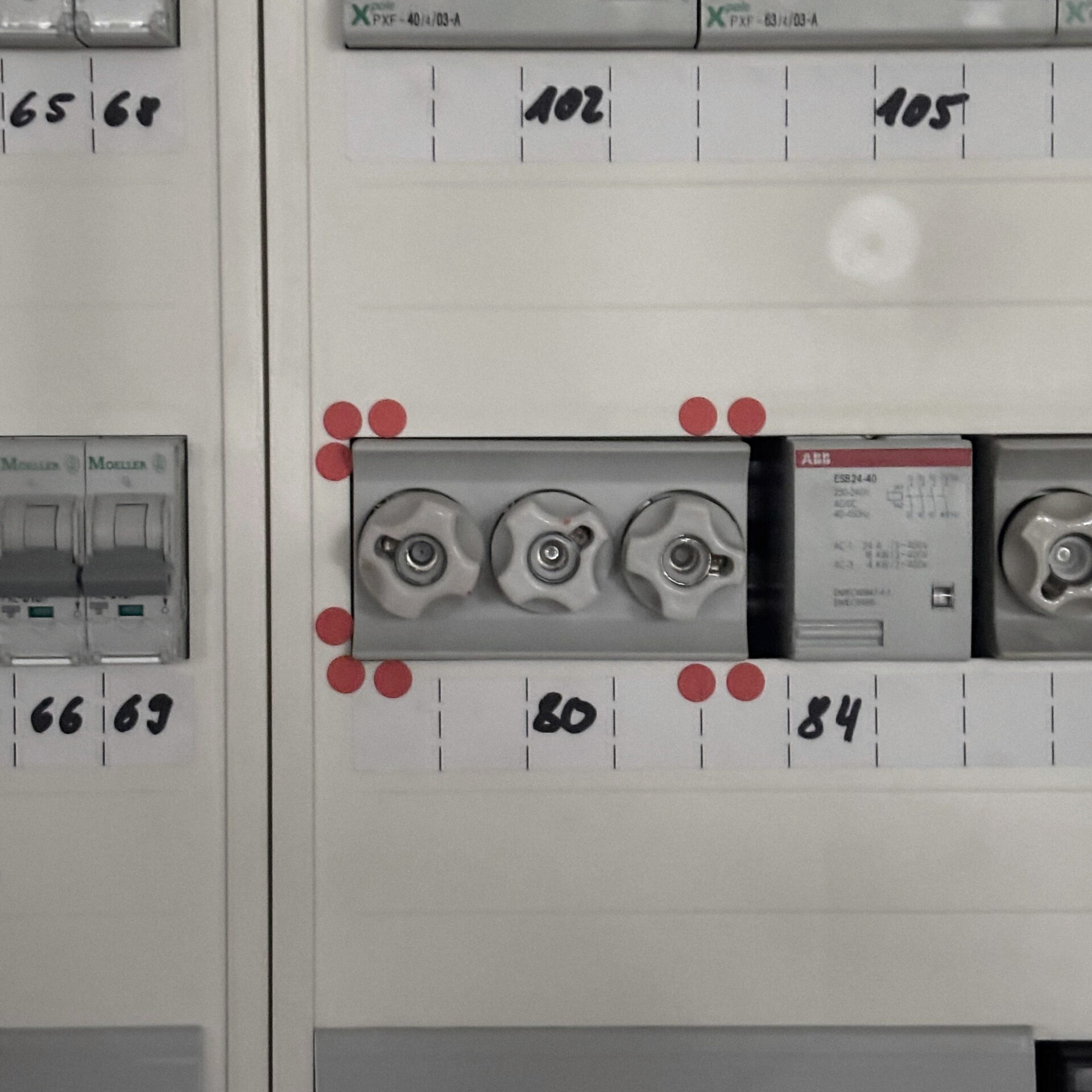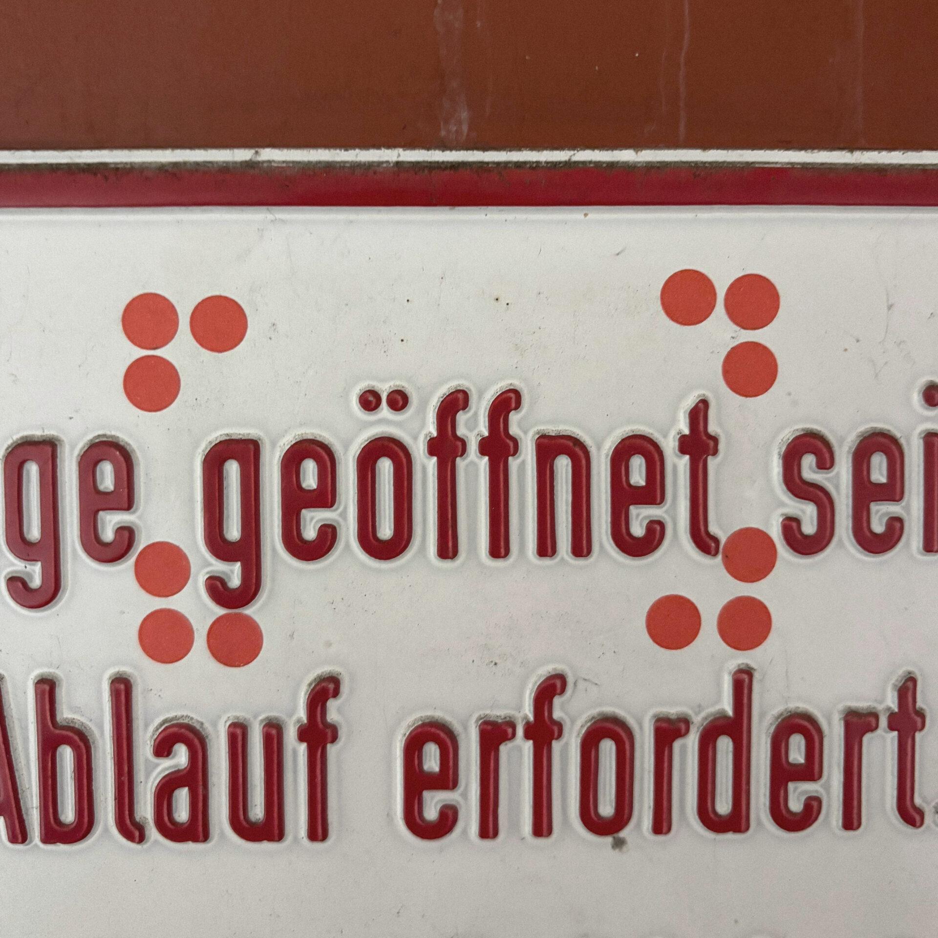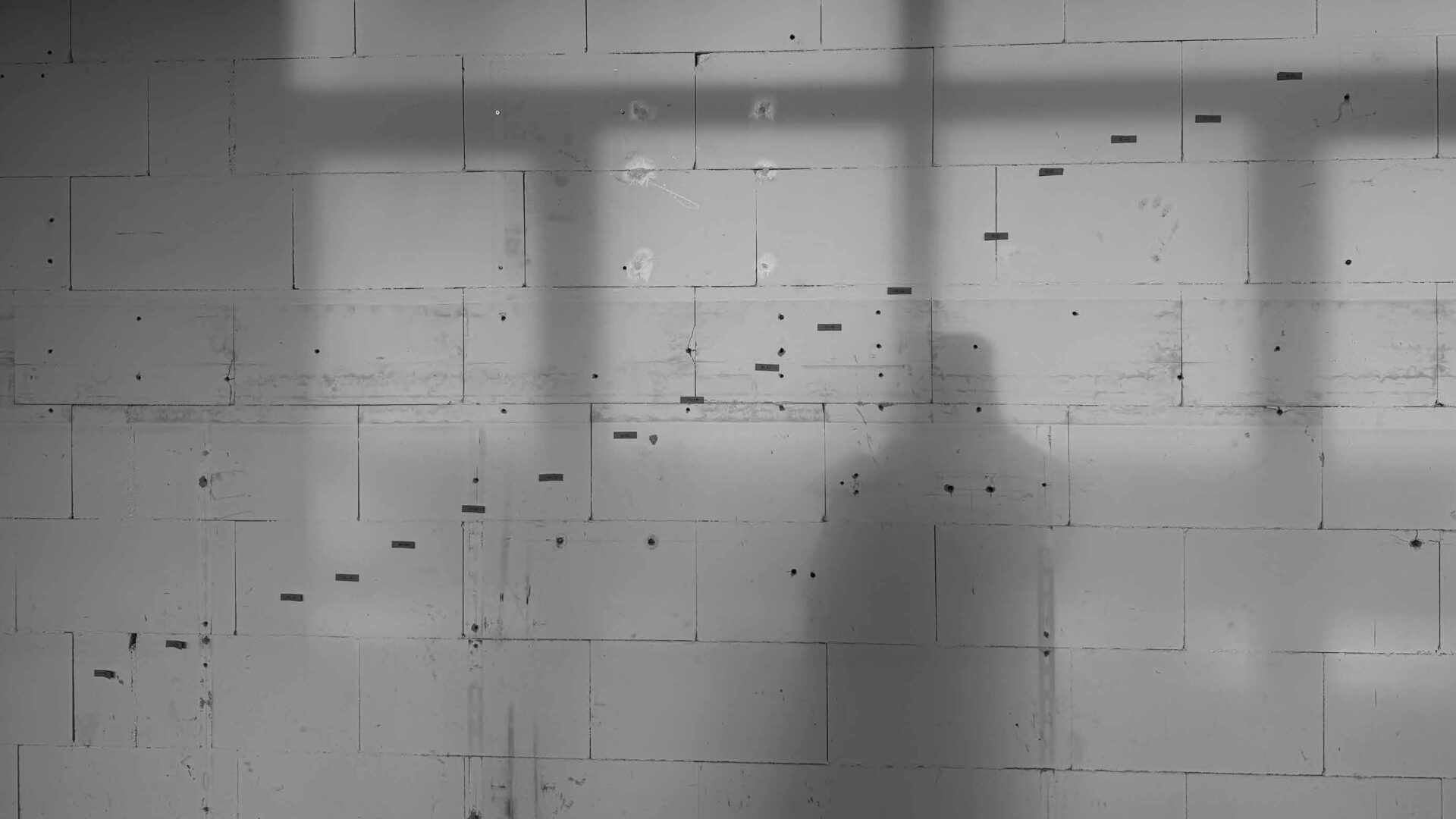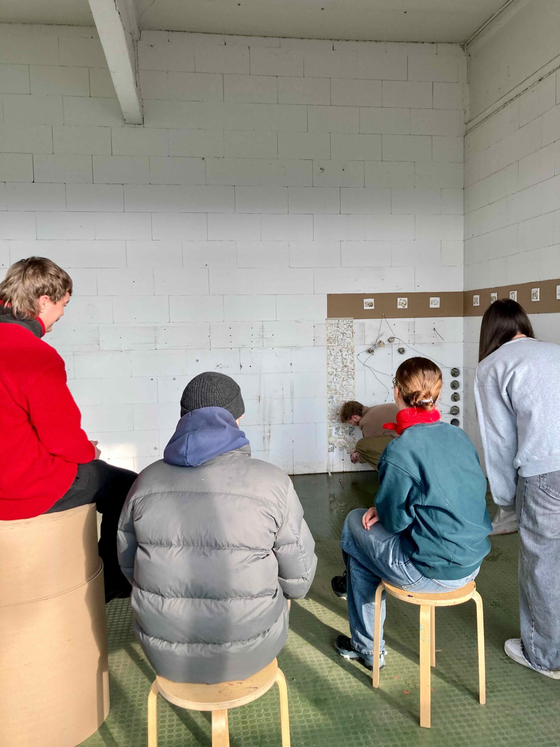Die Wand ist von früheren Nutzungen geprägt. Sichtbar sind Schrauben, Gewindestangen und Dübel, insbesondere rote Kunststoffdübel, die in der Wand verblieben sind. Diese Befestigungs-punkte waren ursprünglich funktional, werden hier jedoch als vorhandenes Material verstanden und weiterverwendet. Jeder Punkt steht für einen einzelnen Eingriff, zusammen bilden sie eine strukturierte Anordnung.