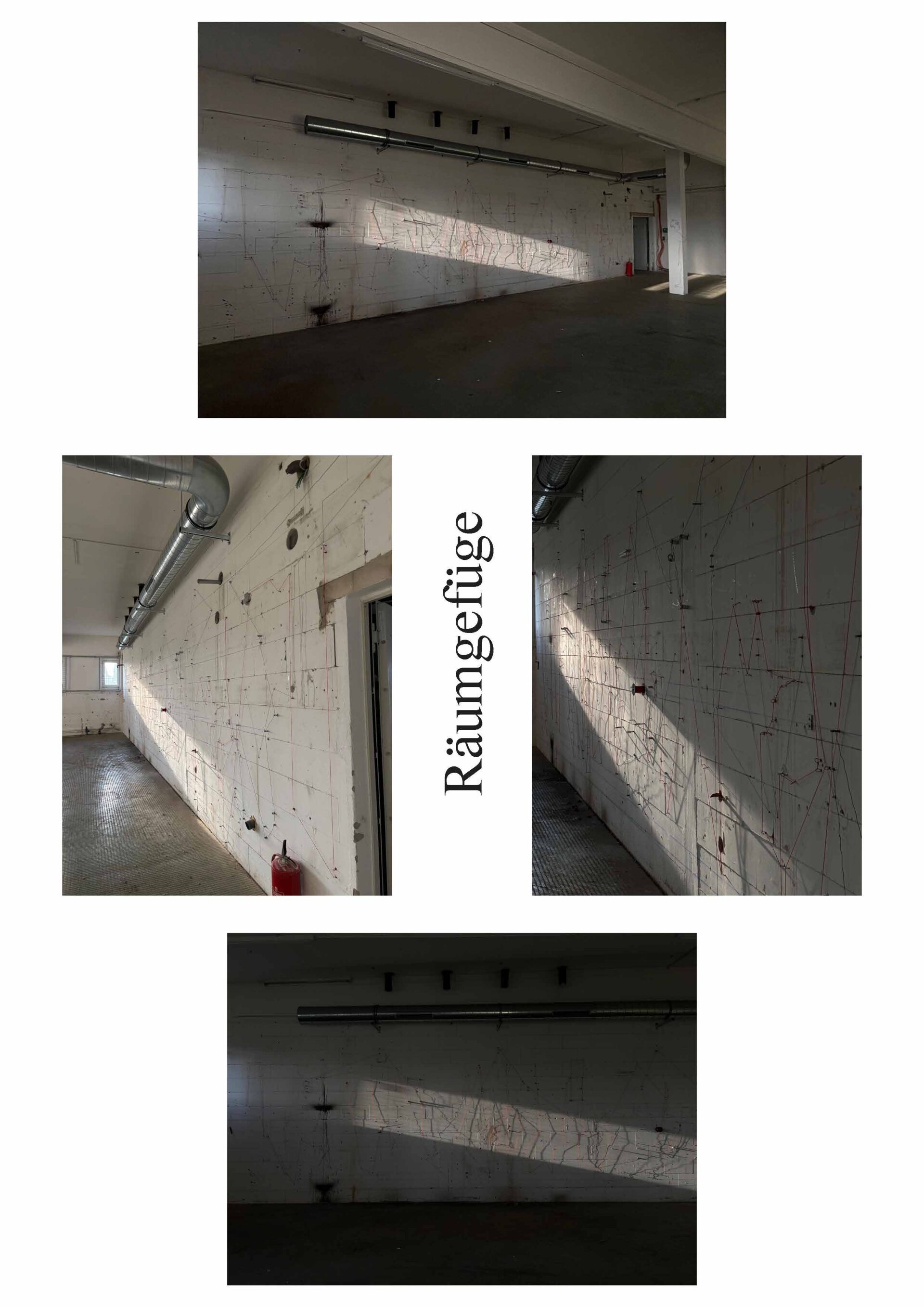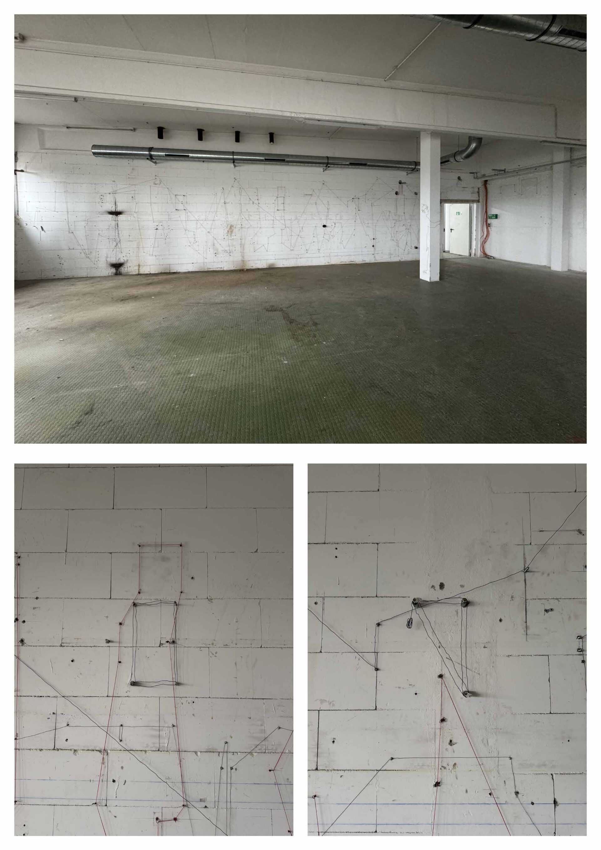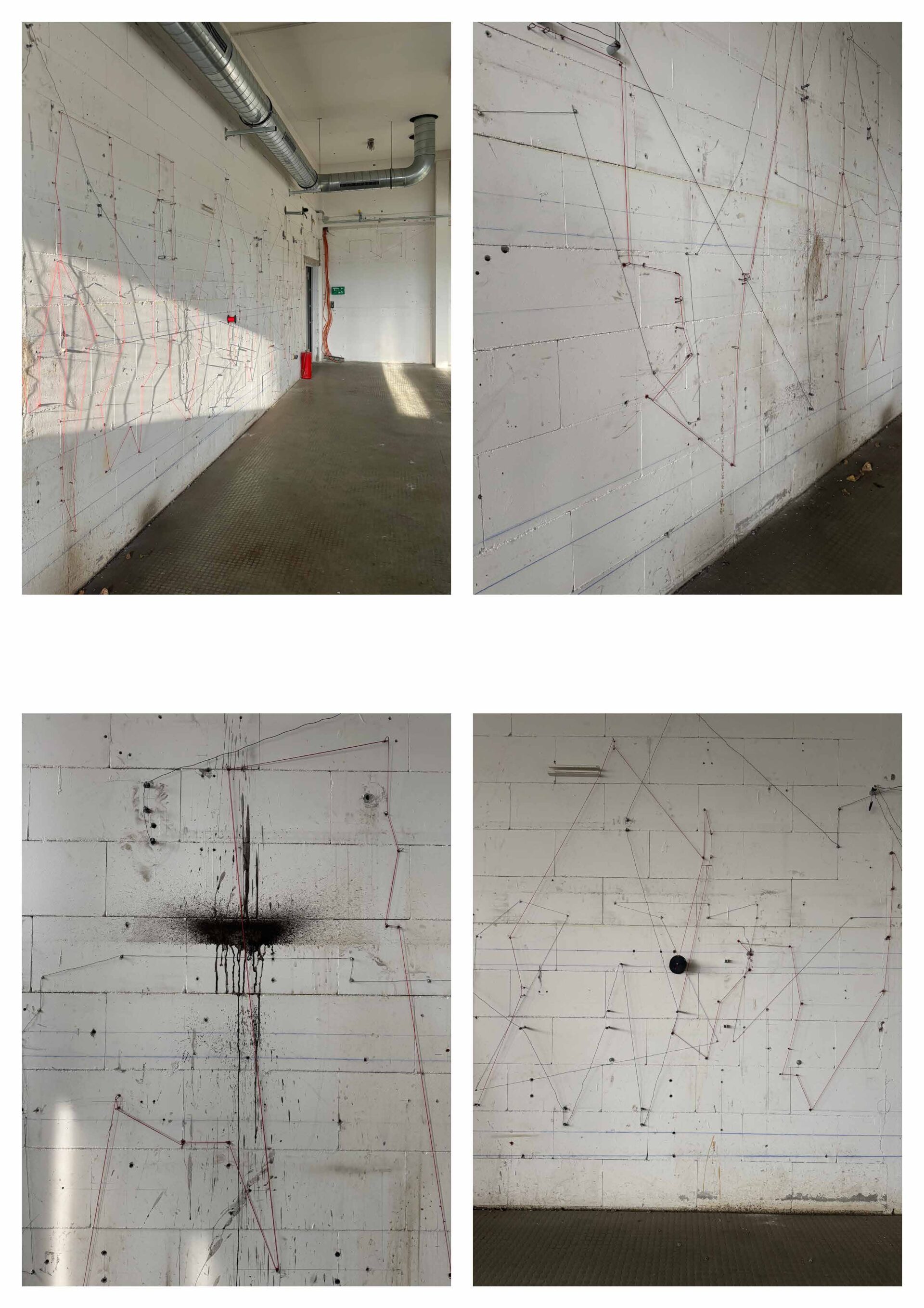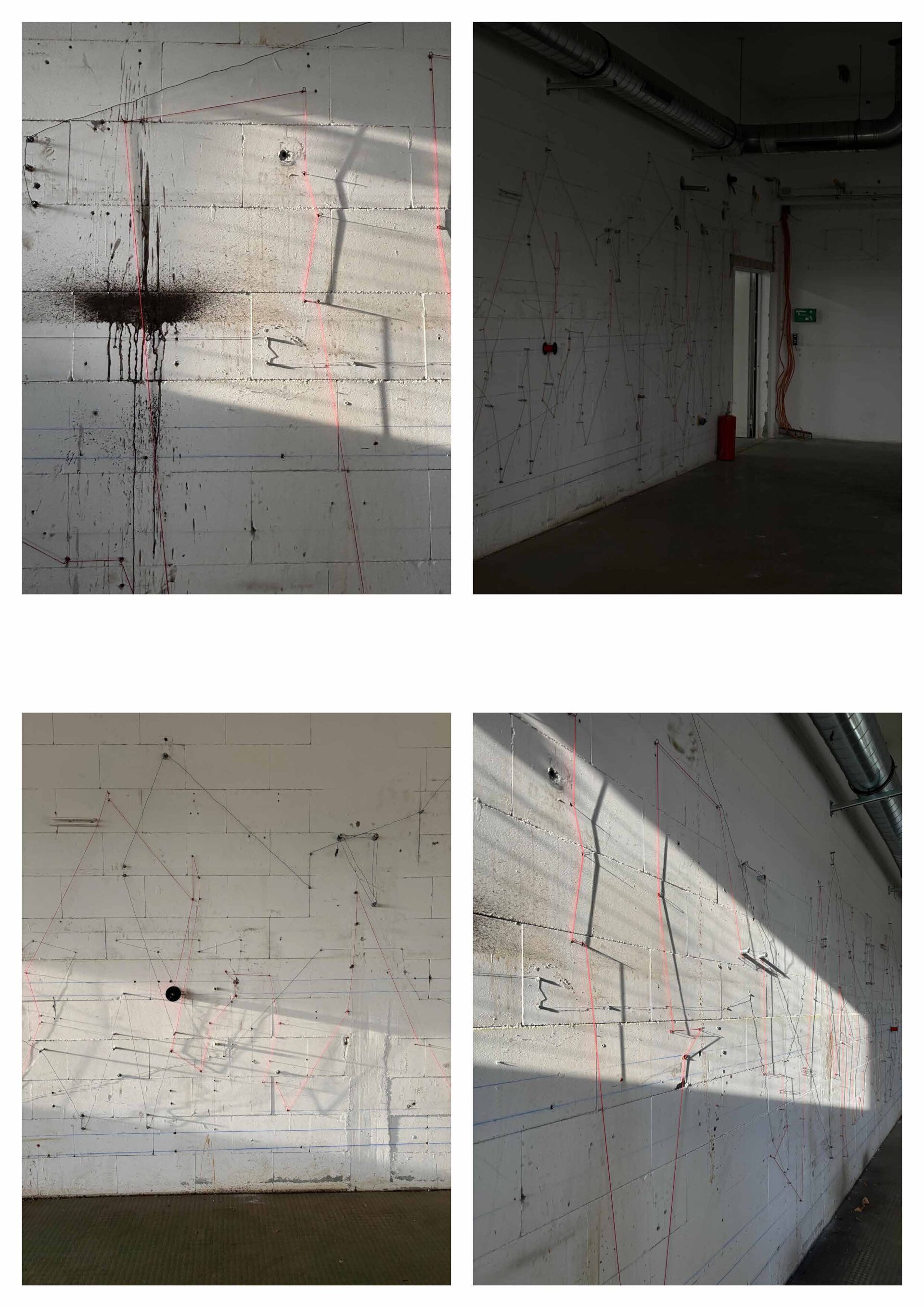 Die Arbeit untersucht die Wand nicht als geschlossene Fläche, sondern als System von Bezie-hungen. Gleiche Elemente werden miteinander verbunden: kleine Schrauben mit dünnem Draht, Gewindestangen mit dickem Draht, rote Dübel mit roter Schnur. Dadurch entstehen verschiede-ne Verbindungsebenen, die sich überlagern und kreuzen. Die bestehende Unruhe und Farbe der Wand wird nicht ausgeglichen, sondern aufgegriffen und weitergeführt.