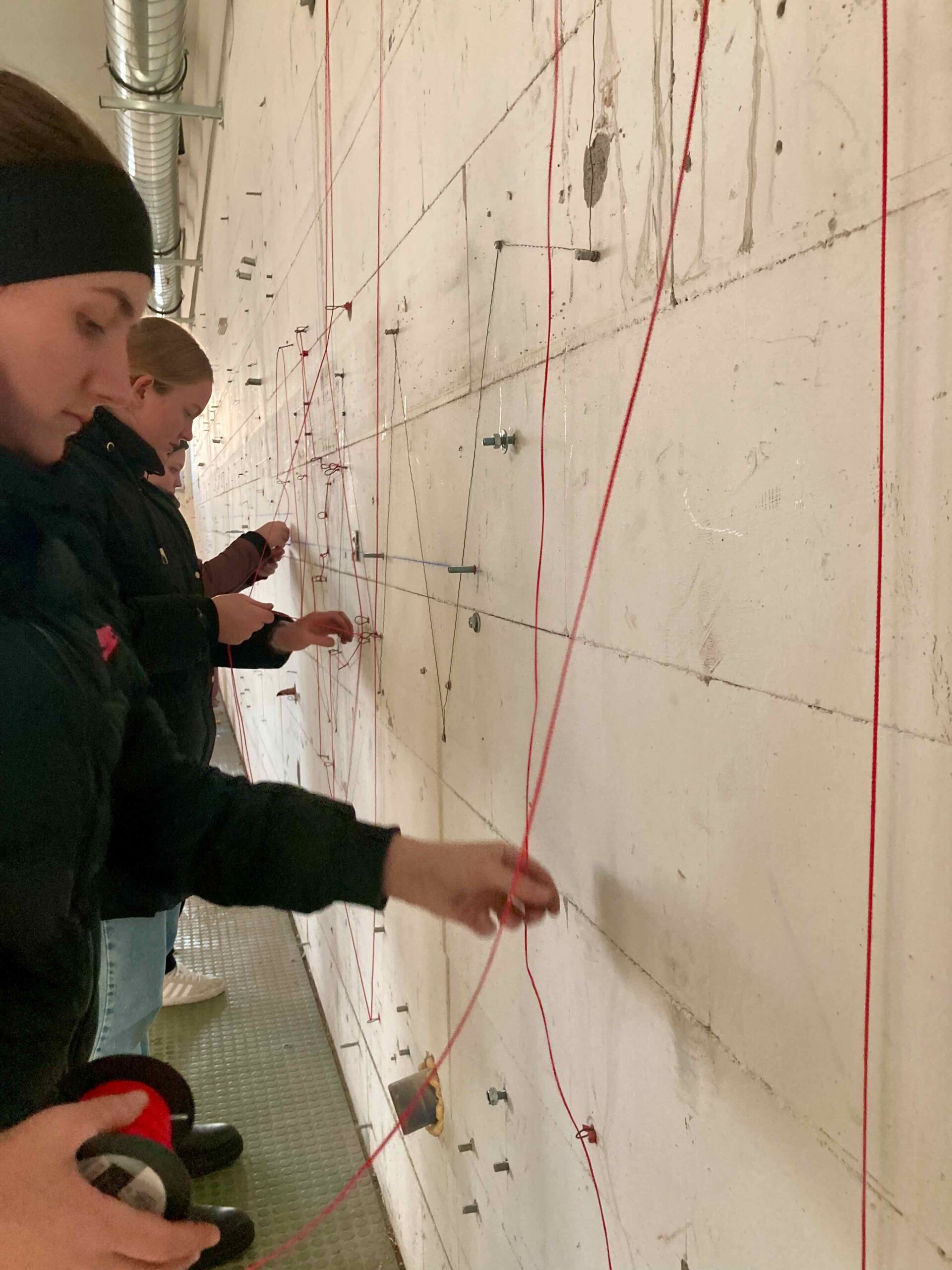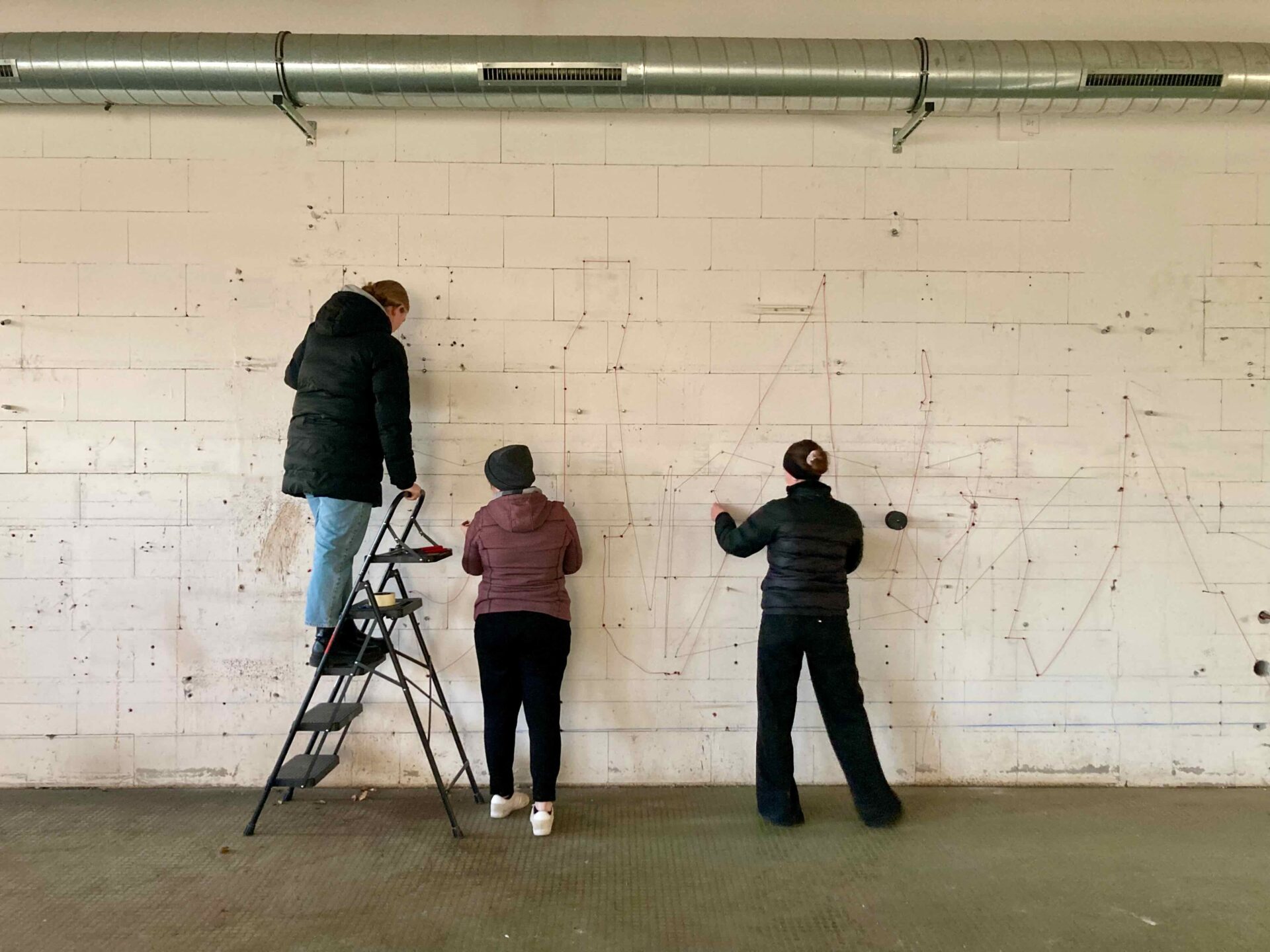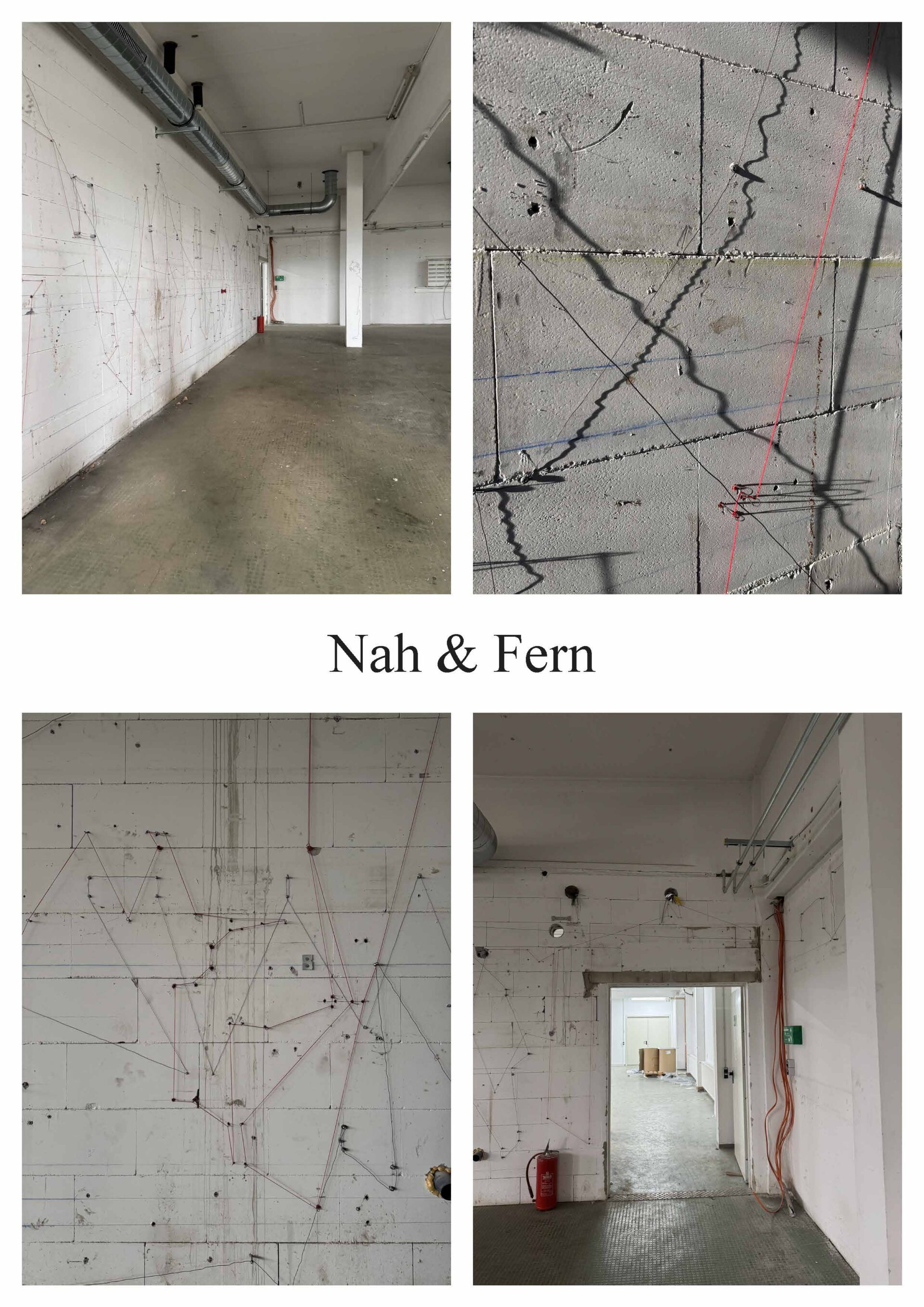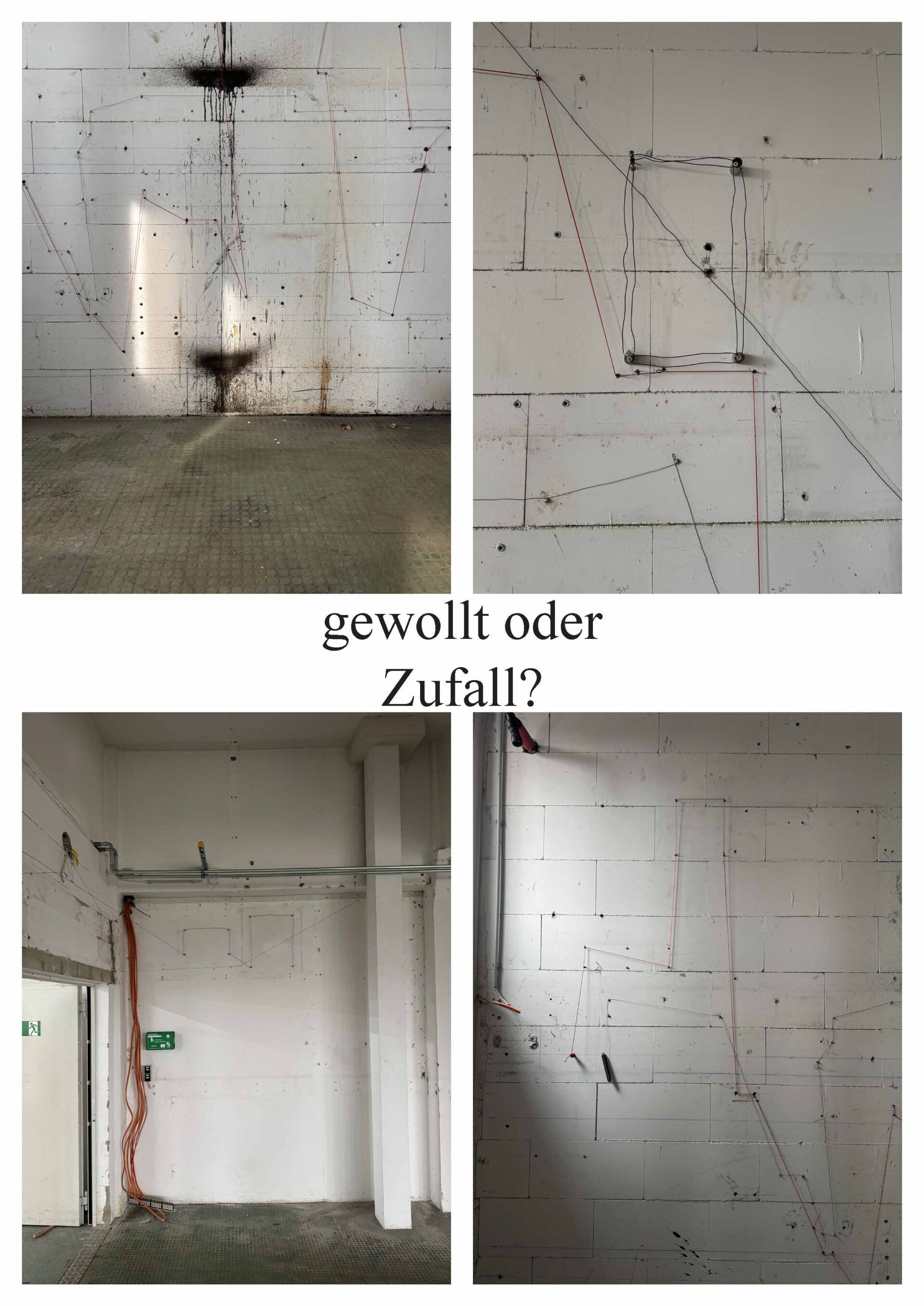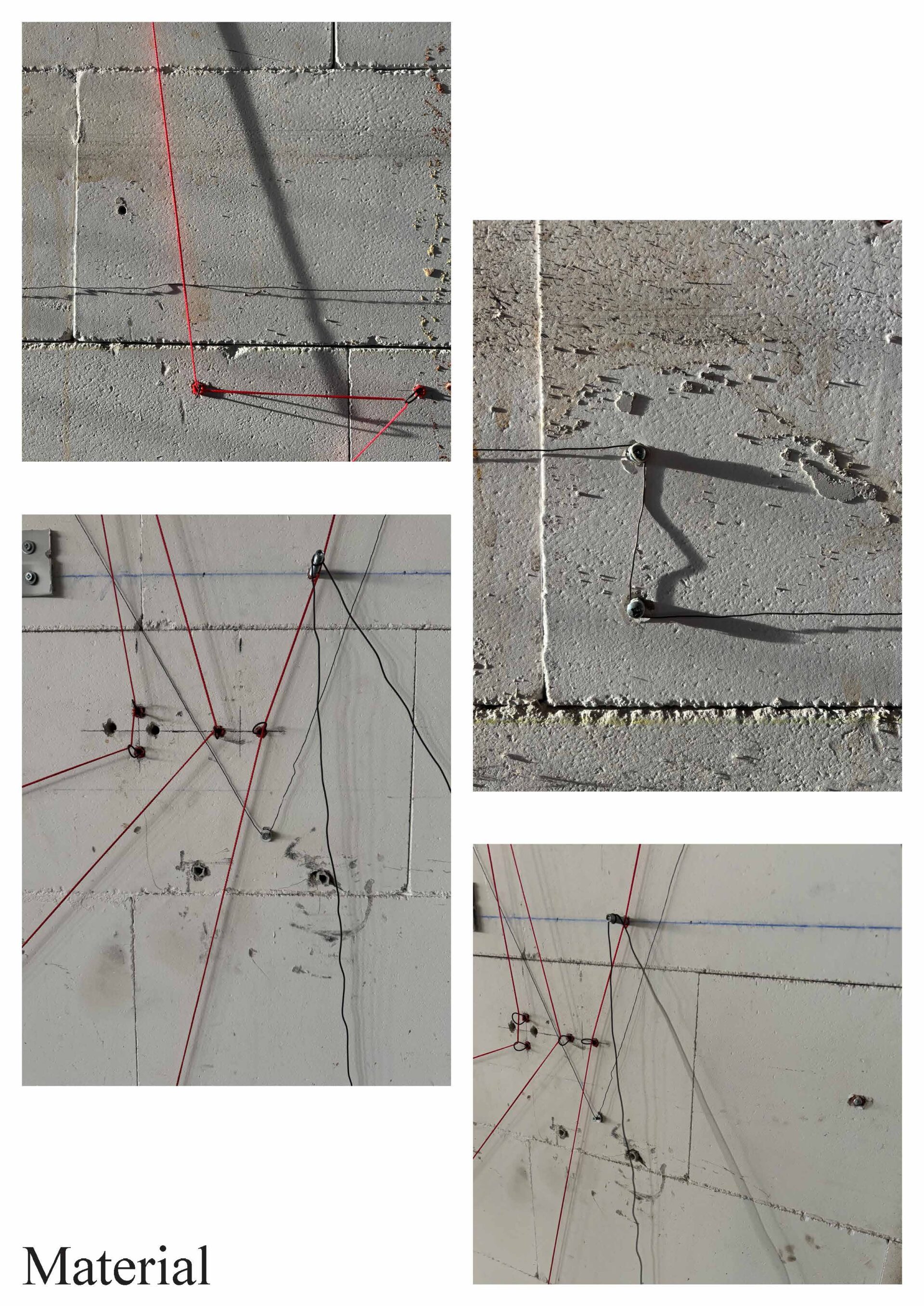 Die Arbeit untersucht die Wand nicht als geschlossene Fläche, sondern als System von Bezie-hungen. Gleiche Elemente werden miteinander verbunden: kleine Schrauben mit dünnem Draht, Gewindestangen mit dickem Draht, rote Dübel mit roter Schnur. Dadurch entstehen verschiede-ne Verbindungsebenen, die sich überlagern und kreuzen. Die bestehende Unruhe und Farbe der Wand wird nicht ausgeglichen, sondern aufgegriffen und weitergeführt.
