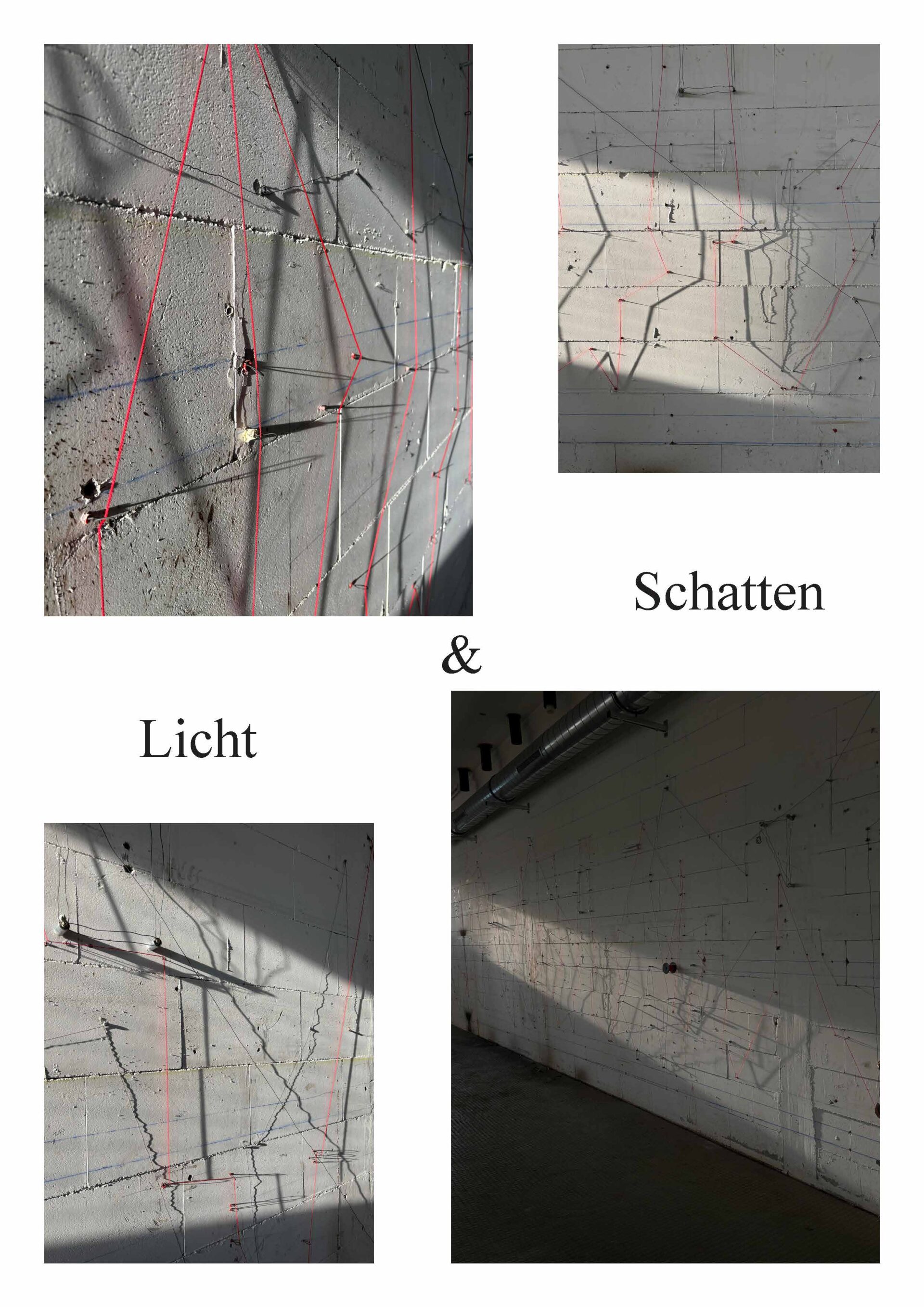 Licht ist ein wesentlicher Bestandteil der Arbeit. Schrauben, Ösen und Drähte werfen Schatten, die als eigenständige Zeichnung auf der Wand erscheinen. Die Schatten der Drähte wirken je nach Material und Abstand unterschiedlich: Dünner Draht erzeugt unruhige, wellige Schatten, während die rote Schnur eine klarere, lineare Schattenform bildet. Mit zunehmendem Abstand zur Wand verändern sich Schärfe und Dichte der Schatten.