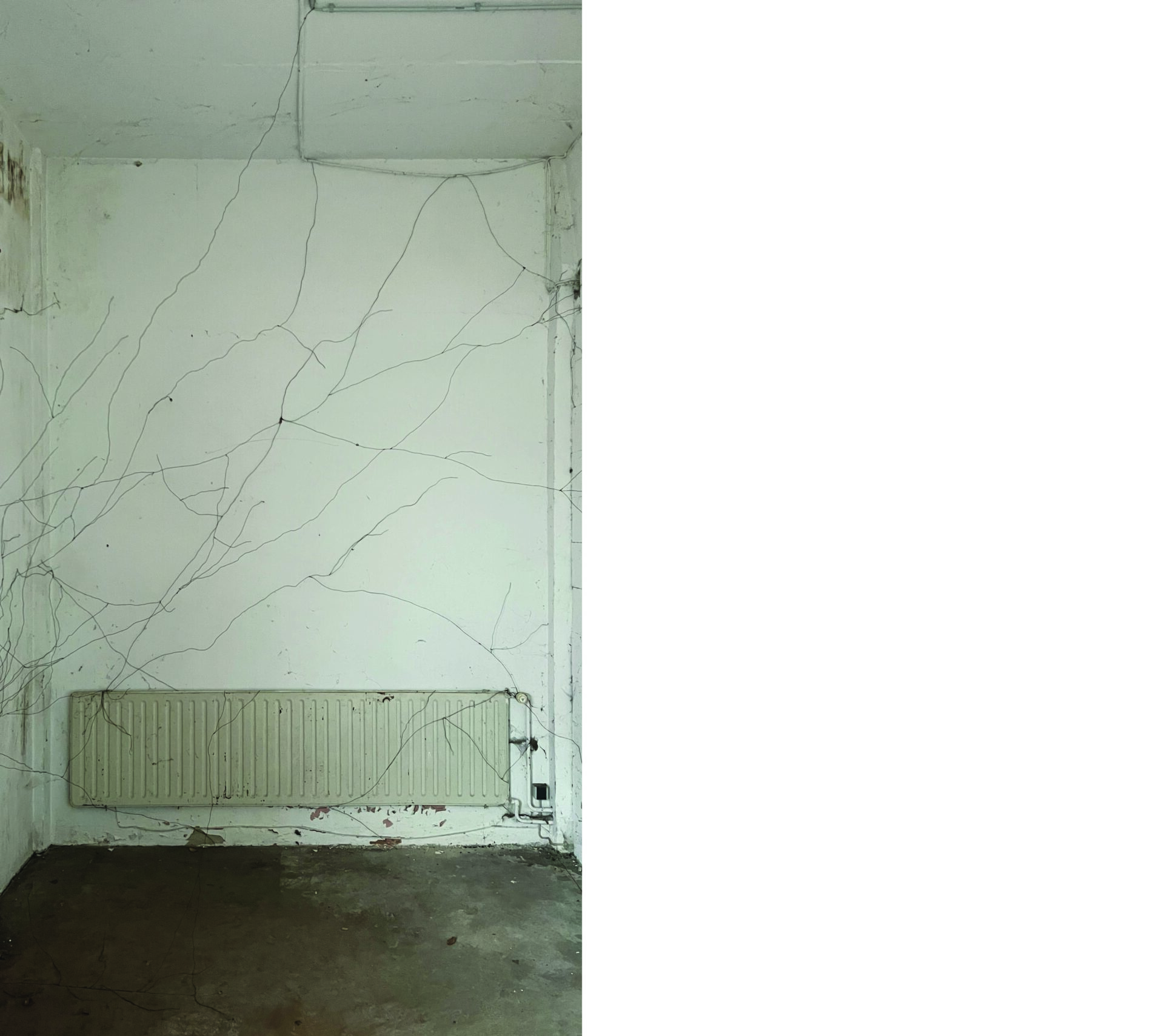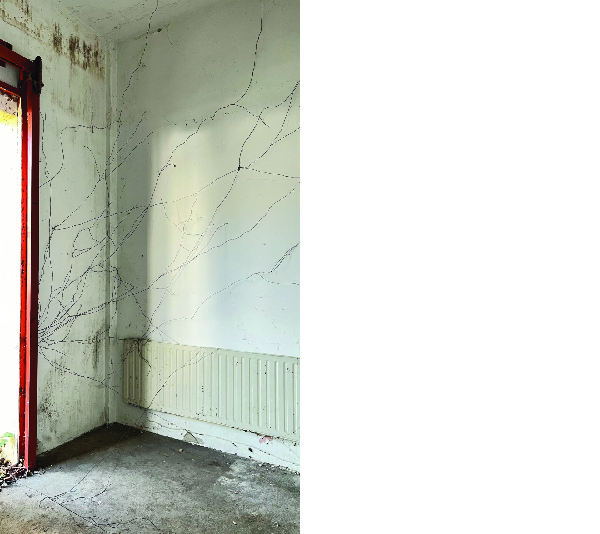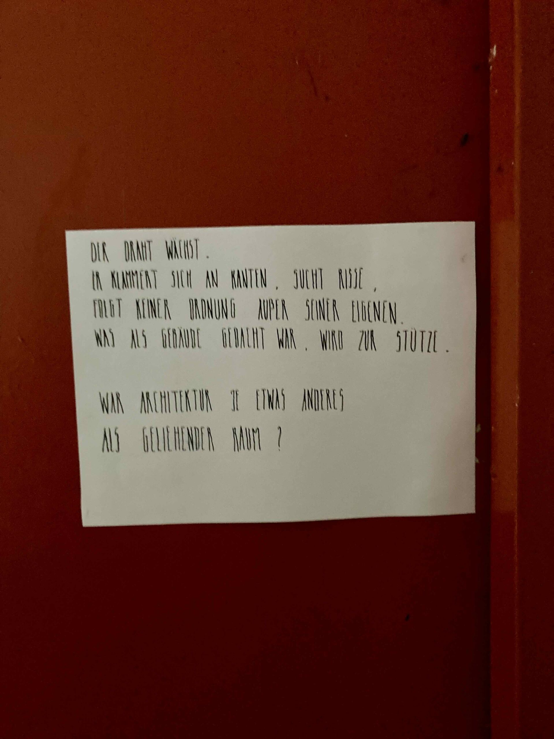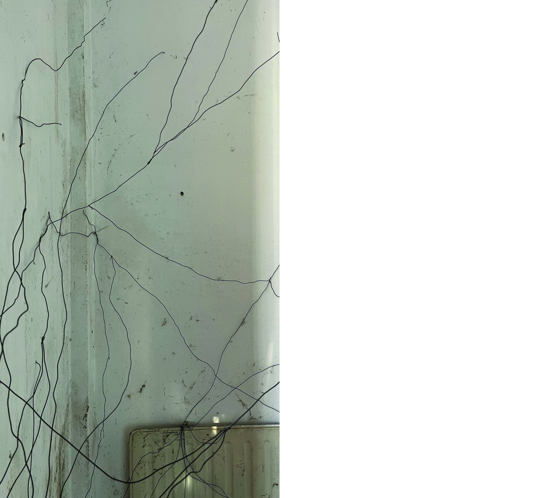 „Der Draht wächst. Er klammert sich an Kanten, sucht Risse, folgt keiner Ordnung außer seiner eigenen. Was als Gebäude gedacht war, wird zur Stütze.“