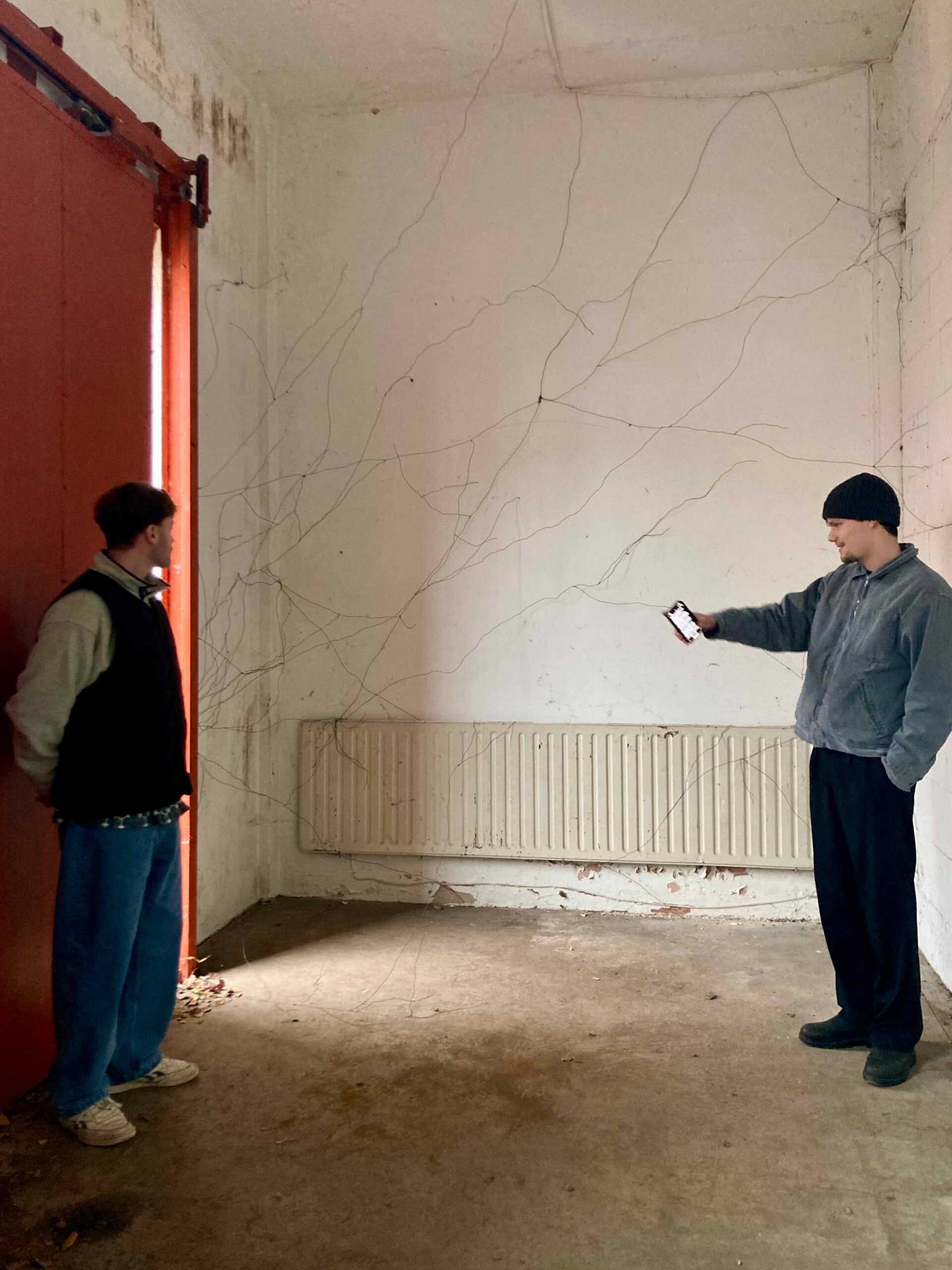 Ein weiterer Ausgangspunkt war der Klang. Die verwendeten Materialien reagieren unterschied-lich auf Berührung. Dicker Draht erzeugt einen gedämpften, schweren Klang, dünner Draht klingt heller und direkter und reflektiert stärker von der Wand. Auch die Länge der Drähte beeinflusst den Ton. Die rote Schnur erzeugt keinen Klang und bleibt rein visuelles Verbindungselement. Die Arbeit bewegt sich zwischen Zeichnung, Klang und Schatten. Die Wand wird nicht über-deckt, sondern als vorhandene Struktur sichtbar und erfahrbar gemacht.