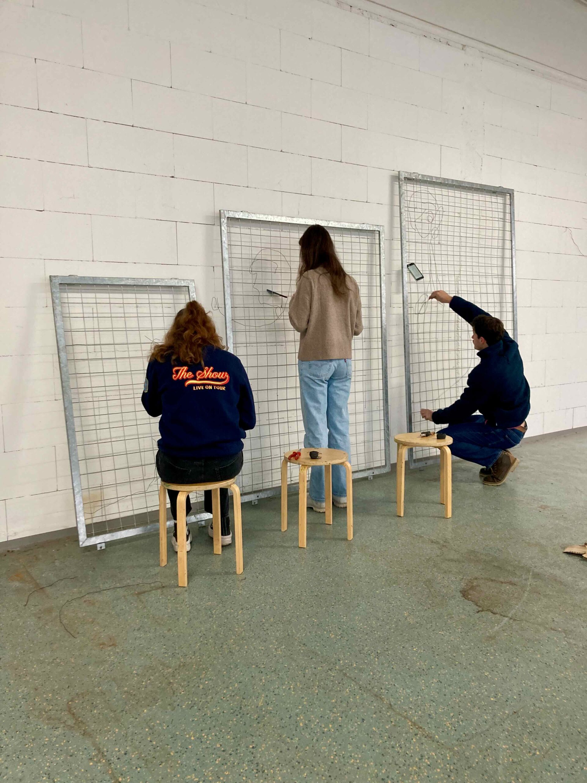 Die Installation zeigt eine Generationen Szene in drei Akten. Die Figuren sind auf einem Gitter konstruiert und aus Rödeldraht gezeichnet, der in das Gitter eingeflochten wurde. Durch diese Technik überschreiten die Figuren den Rahmen der Fläche, treten aus ihr heraus und scheinen miteinander zu interagieren.