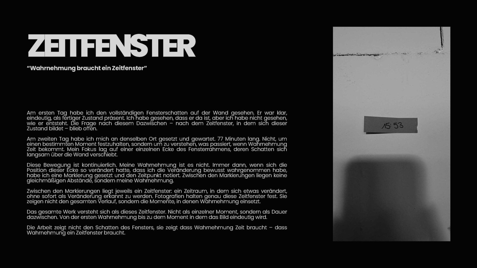 Die Arbeit zeigt nicht den Schatten des Fensters, sie zeigt dass Wahrnehmung Zeit braucht – dass Wahrnehmung ein Zeitfenster braucht.